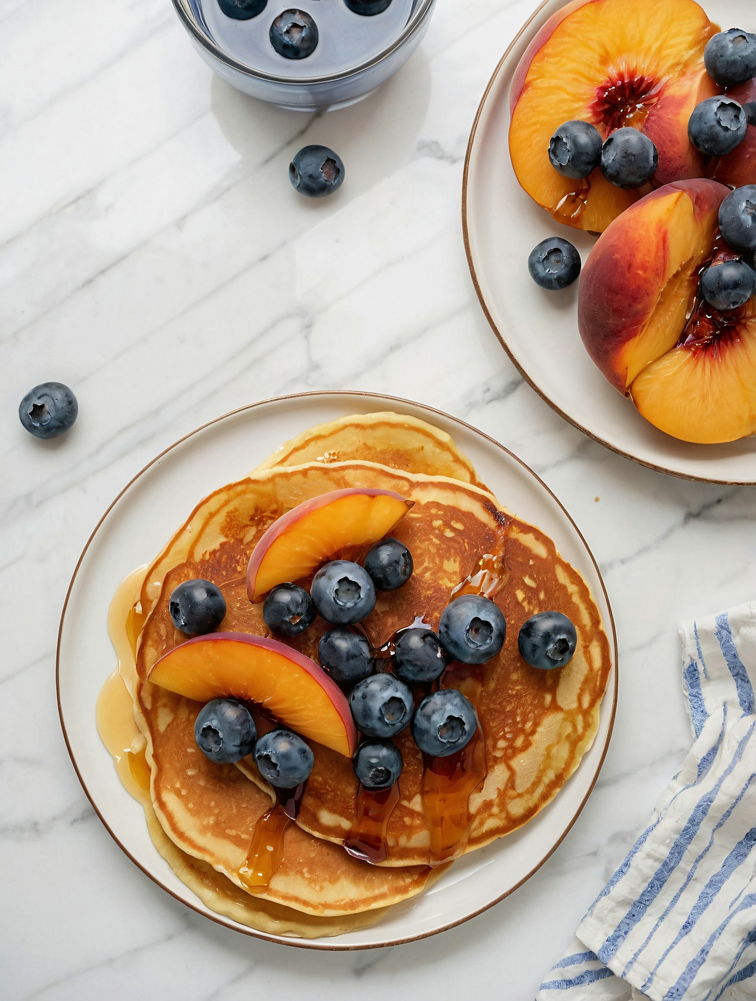 Fluffy pancakes topped with fresh blueberries, peach slices, and syrup on a marble table. A perfect breakfast idea!