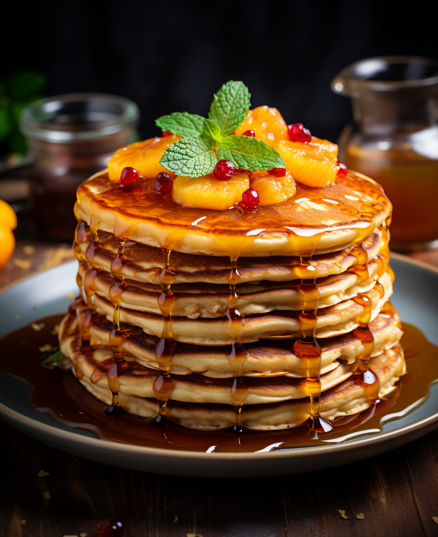 Stack of golden pancakes with syrup, mint, orange slices, and berries on a plate. Perfect breakfast delight with a fresh, colorful garnish.