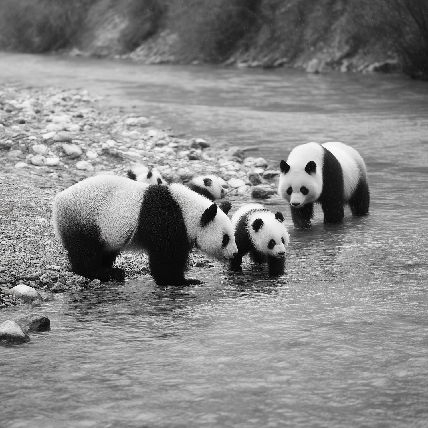 A family of pandas gathers by a shallow river, with adults and cubs exploring the water in a tranquil black-and-white scene.