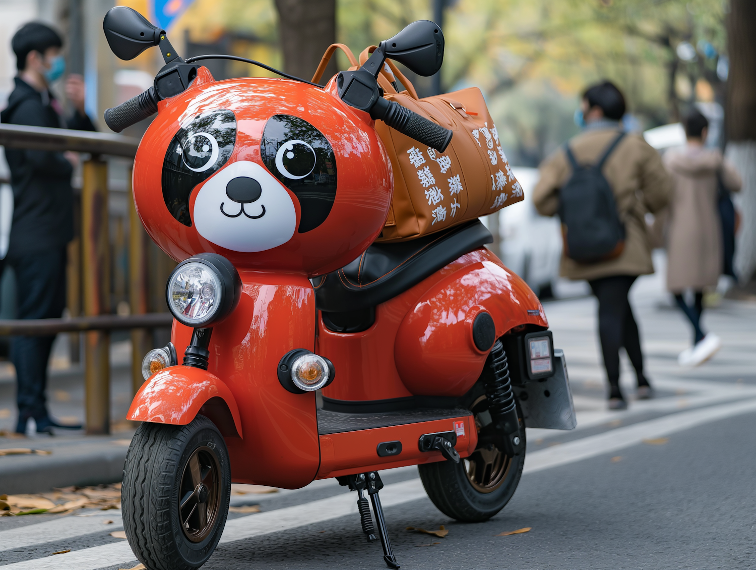 Red cartoon-themed scooter with a panda face parked on a city street, featuring a brown bag with foreign text. Urban life in the background.