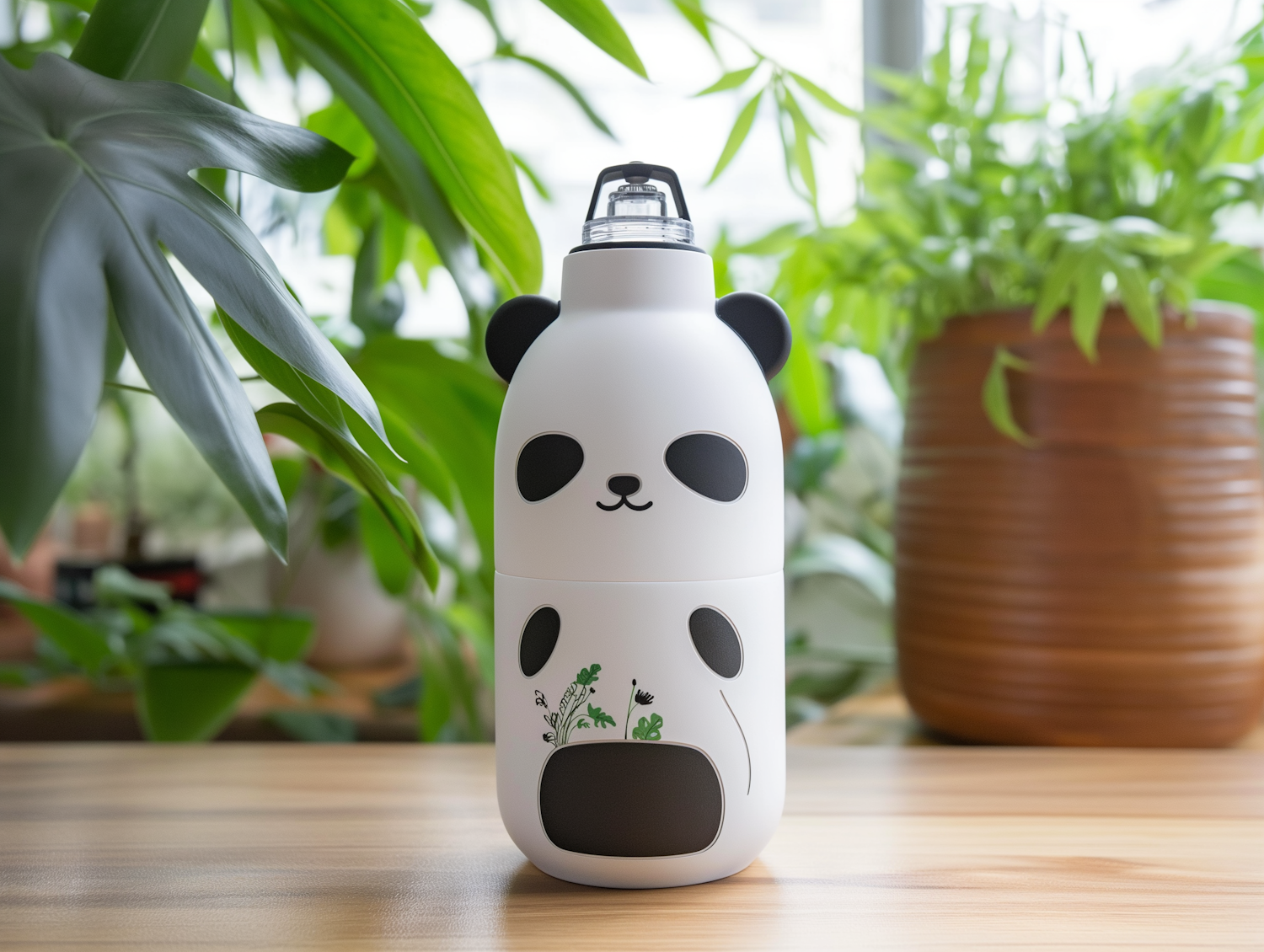 Adorable panda-themed water bottle with plant graphics, surrounded by lush greenery on a wooden surface.