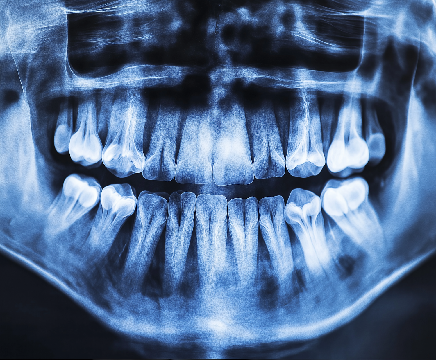 Dental X-ray showing a full set of teeth with clear detail in blue tones, highlighting dental structure and alignment.