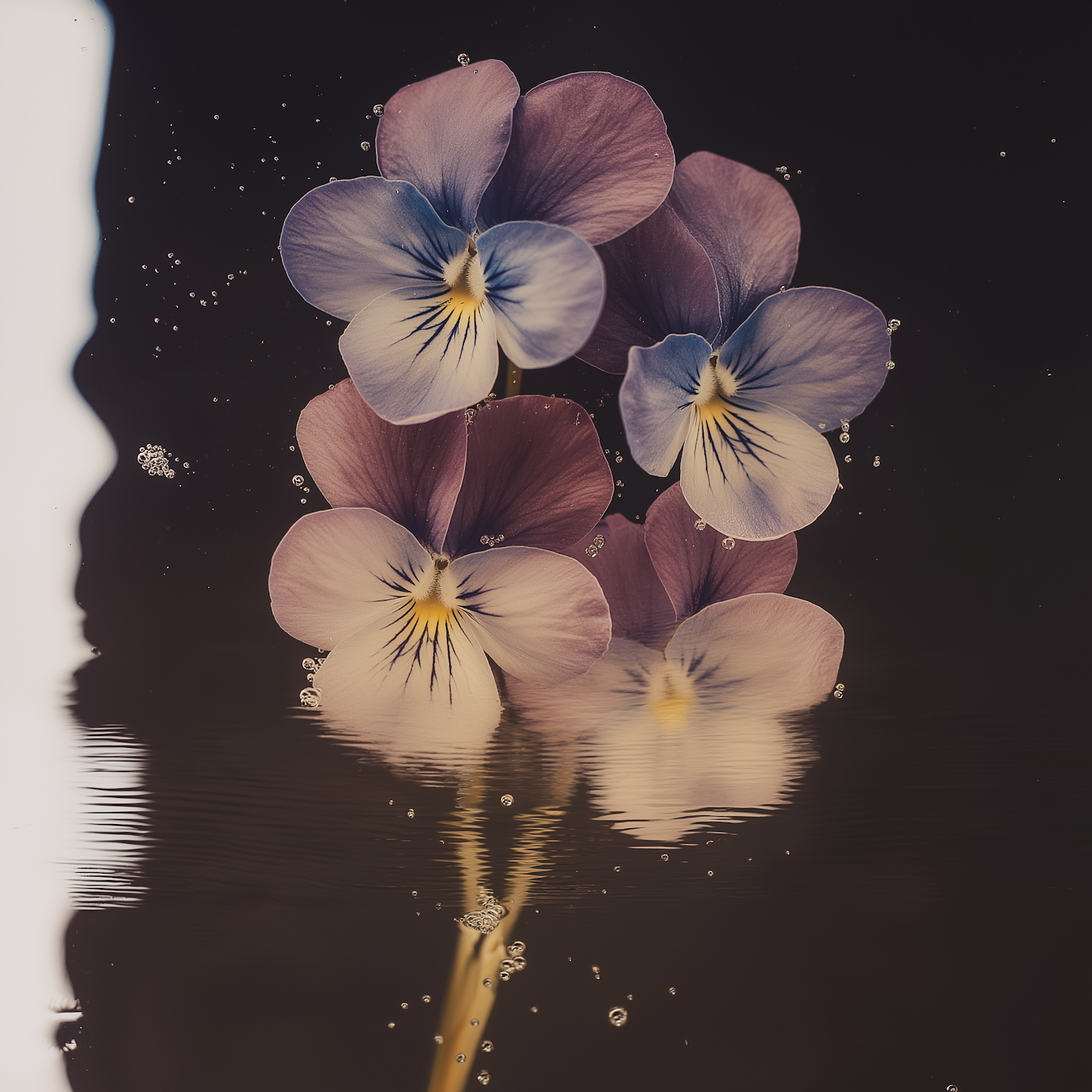 Beautiful close-up of purple and blue pansy flowers reflected in water, creating a serene and artistic composition.