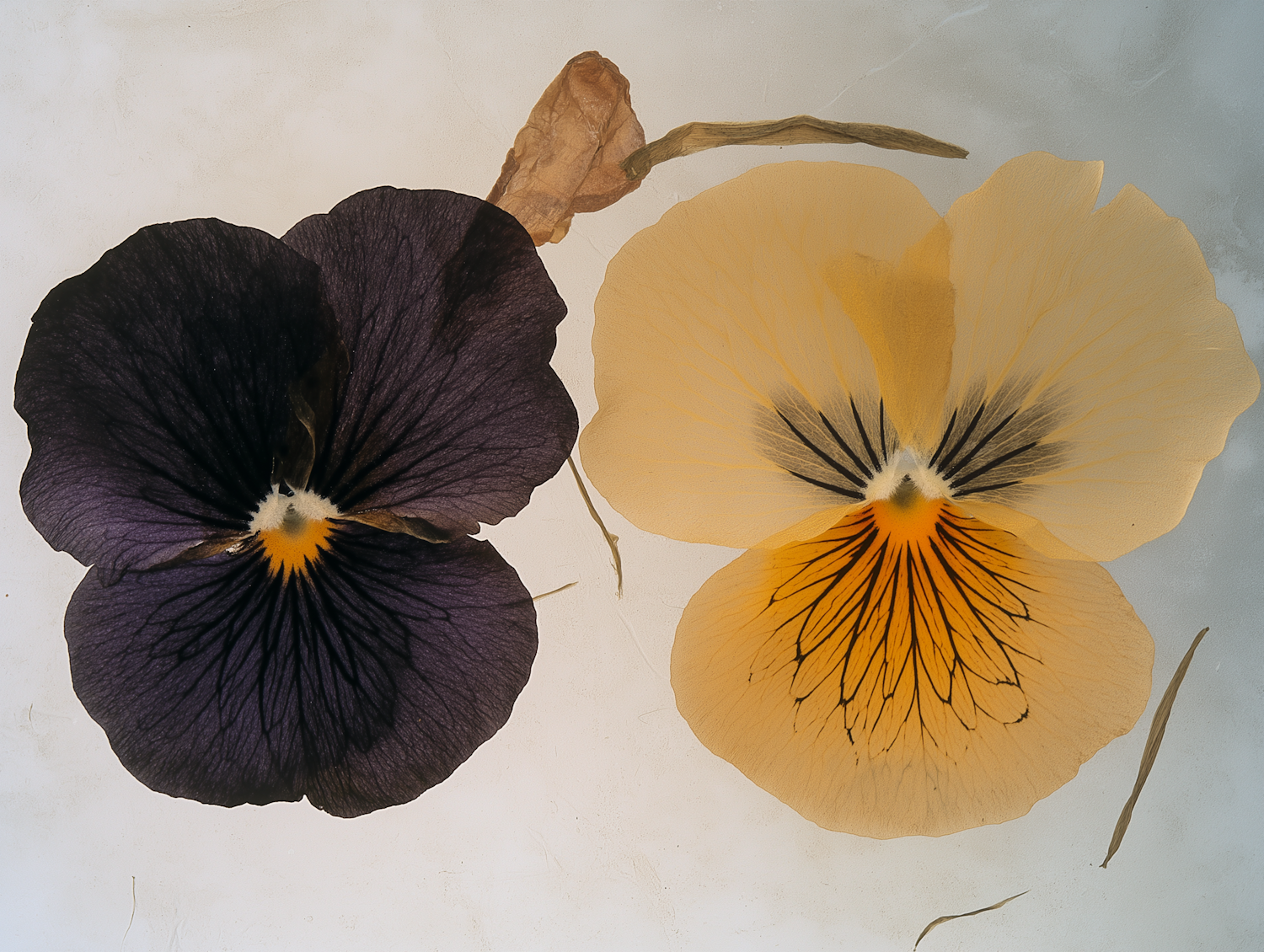 Two pansy flowers, one deep purple and one cream, with intricate veining and yellow centers, displayed on a light background.
