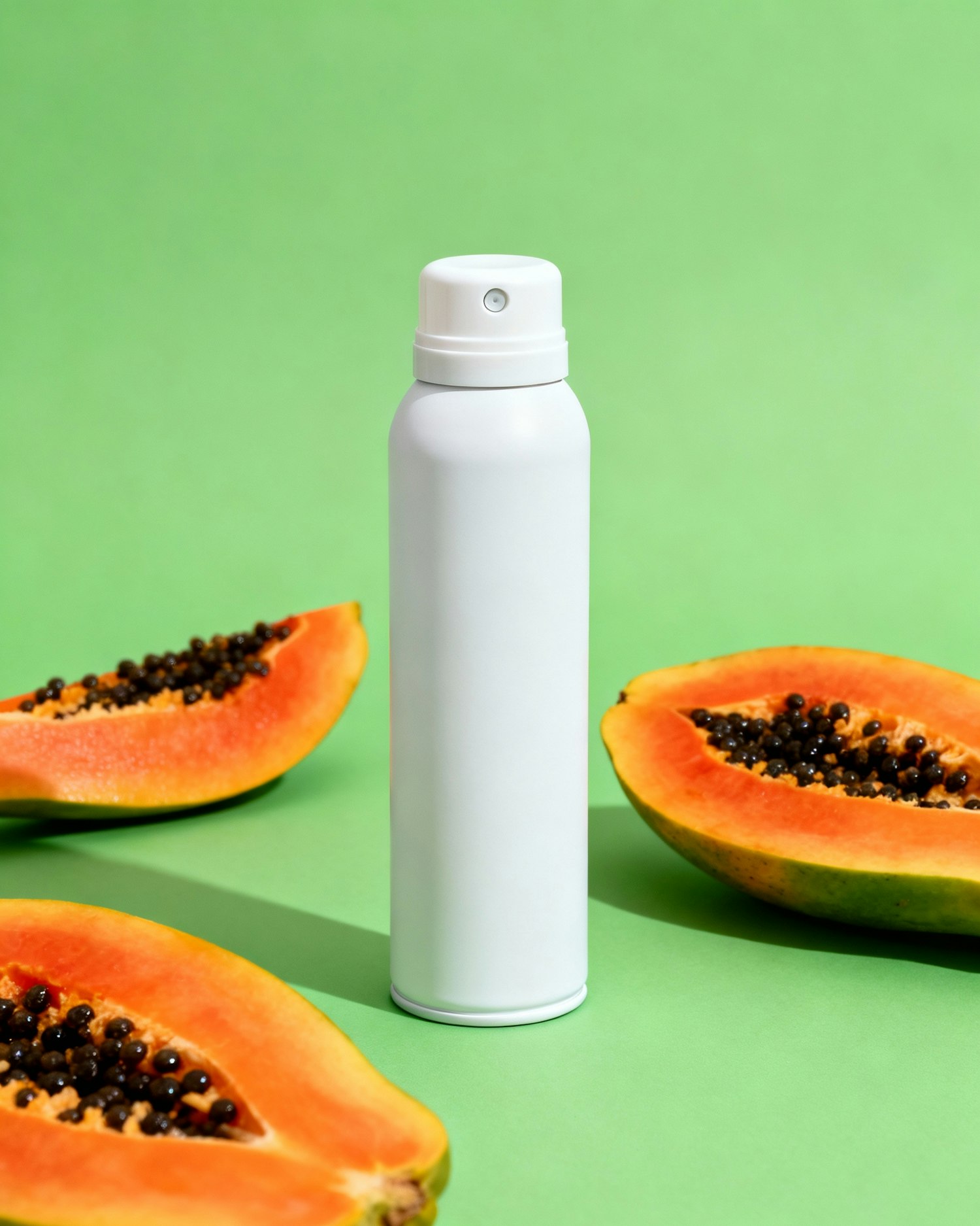 ultra-realistic studio product photography, clean lighting, soft natural reflections, accurate textures, subtle shadows, premium editorial style, no labels, no logos, no distortion. aerosol deodorant in white with a soft matte finish, smooth seamless cylinder, same color from body to cap, minimal rounded plastic cap, small integrated press-button diffuser, modern clean silhouette, no metallic shine, no gloss, no reflective aluminum texture. papaya slices framing the scene, lime-green background