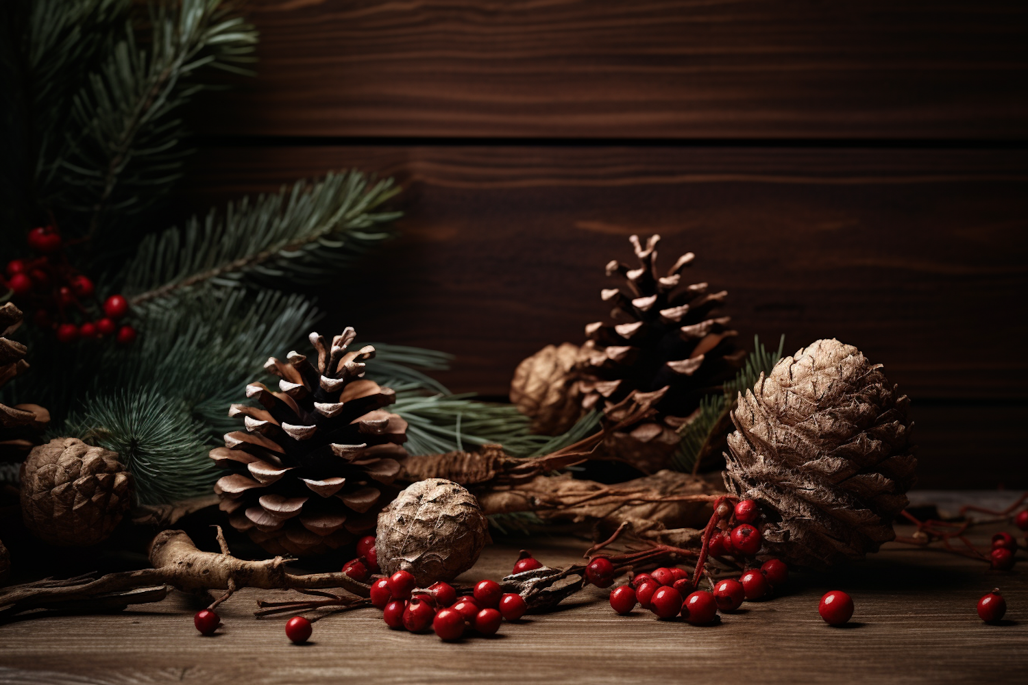 Rustic holiday decor with pinecones, evergreen branches, and red berries on a wooden background.