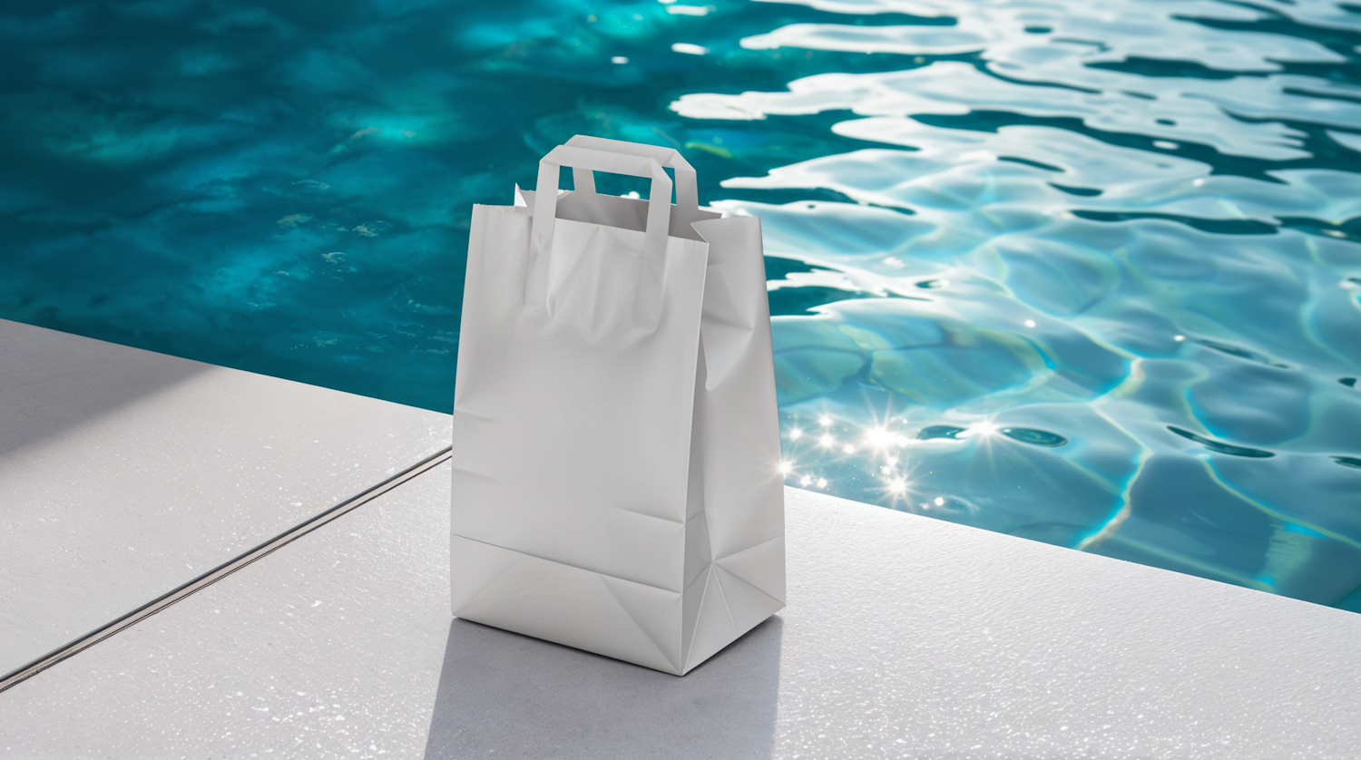 White paper bag on a poolside, reflecting sunlight on vibrant blue water. Minimalist and serene summer scene.