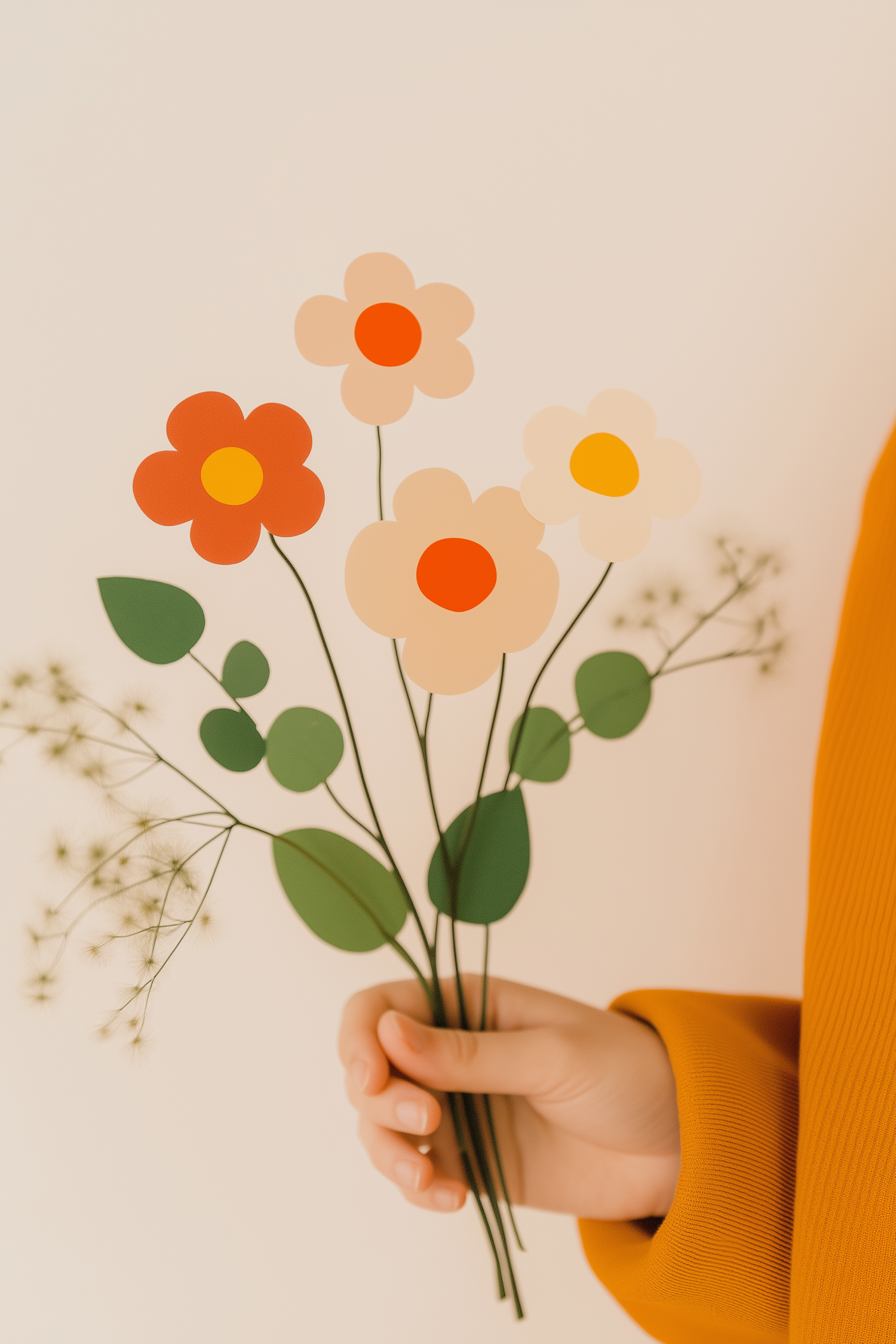 A hand holding a bouquet of colorful paper flowers with a minimalist design, set against a soft beige background for a warm aesthetic.