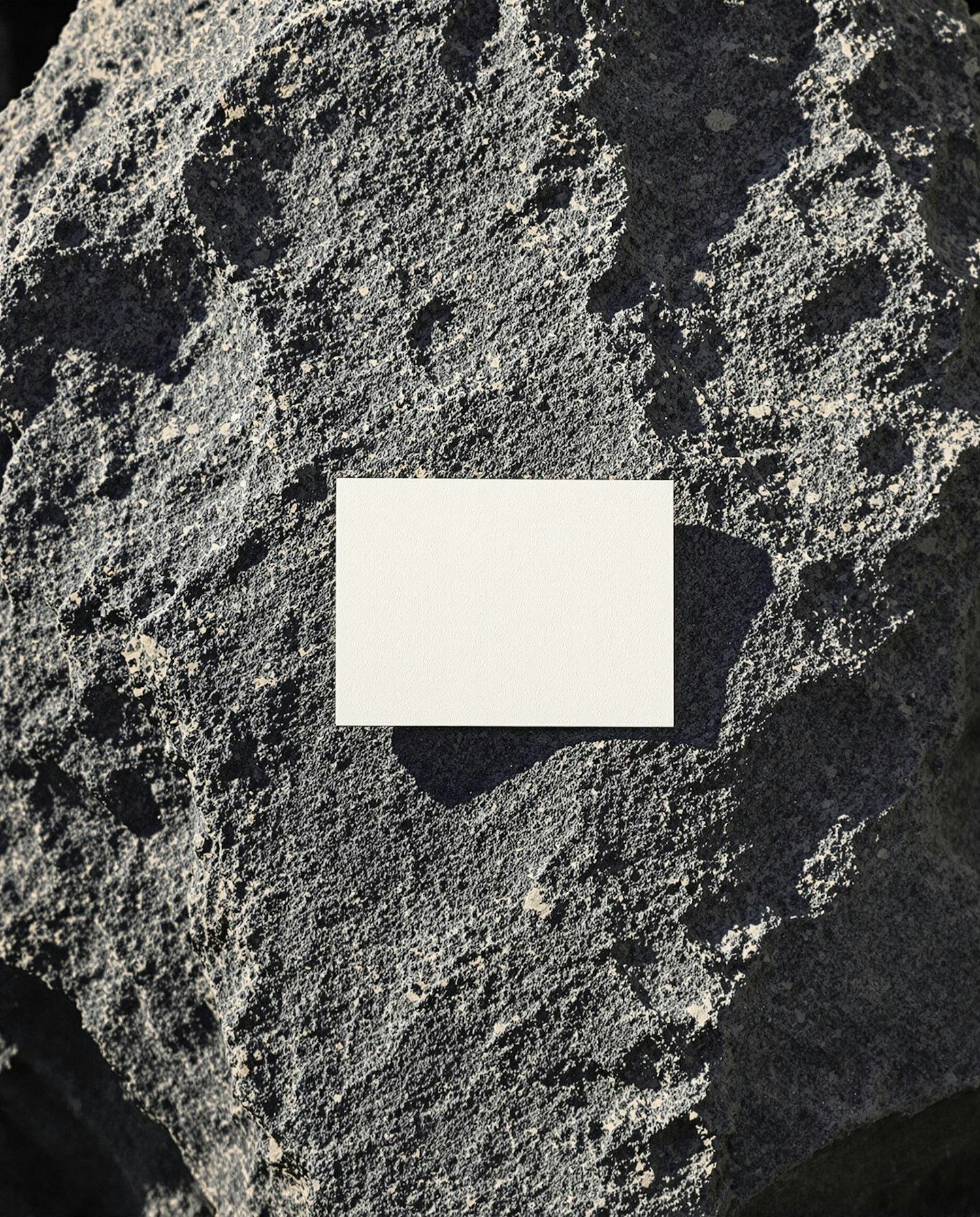 Rectangular paper on a textured dark rock, contrasting smoothness with rugged details and natural sunlight casting shadows.