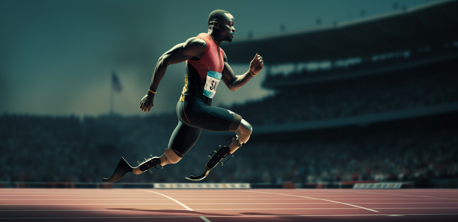 Inspirational image of a Black athlete sprinting with prosthetic blades on a track, showcasing determination and athleticism.