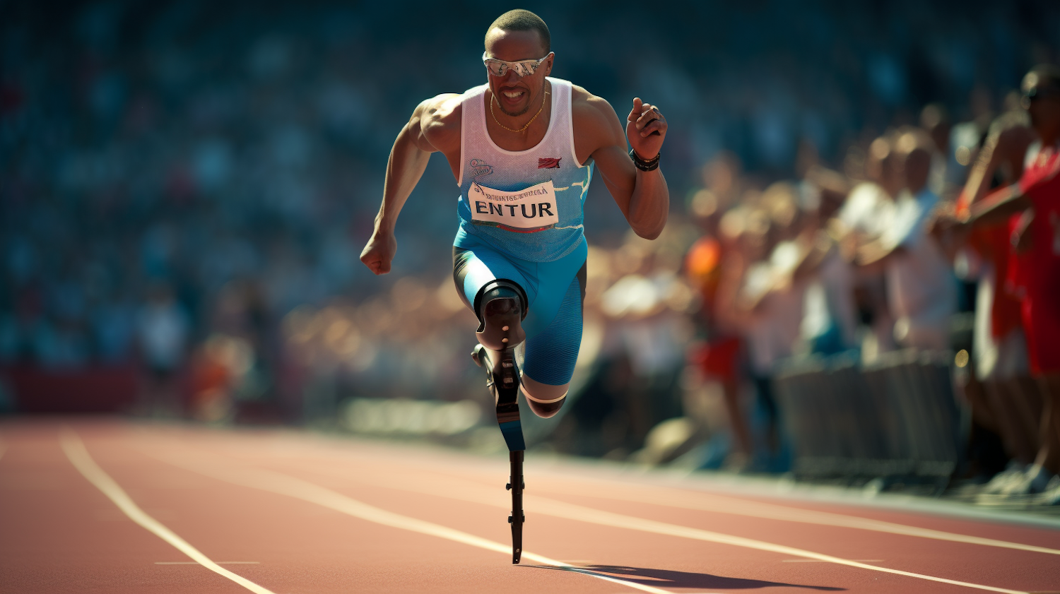 Inspirational athlete with a prosthetic leg sprinting on a track, showcasing determination and strength during a competitive race.