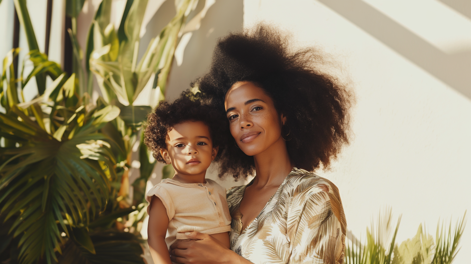A parent and child outdoors against tropical greenery, portraying warmth and natural beauty in a sunlit environment.