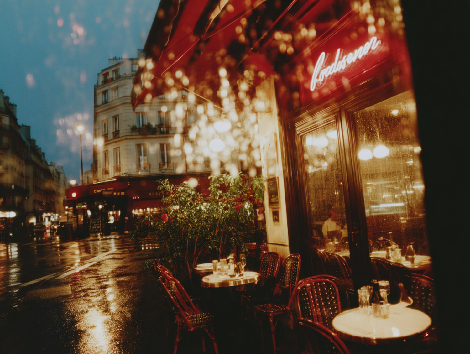 A rainy evening in Paris with a cozy café, warm lights, and reflections on the wet pavement creating a romantic ambiance.