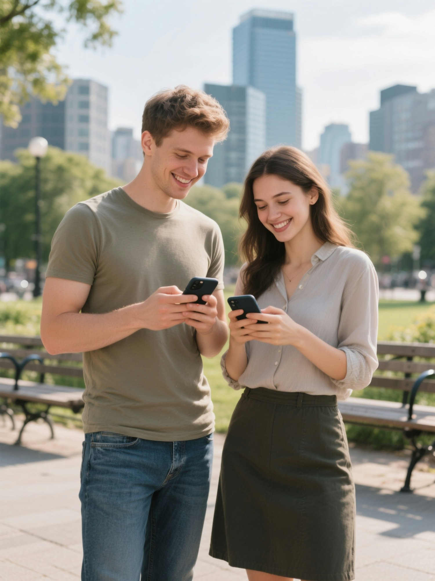 A young man and woman smiling while looking at their phones in a sunny park with a cityscape in the background.