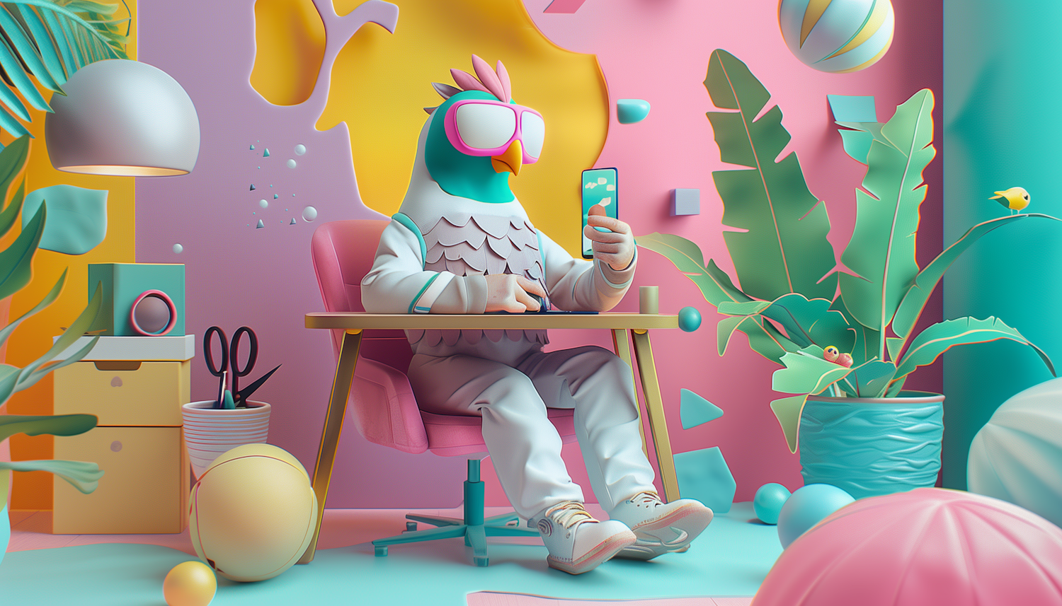 Whimsical bird character in a colorful office setting, engaging with a smartphone. Vibrant pastel colors and playful decor.