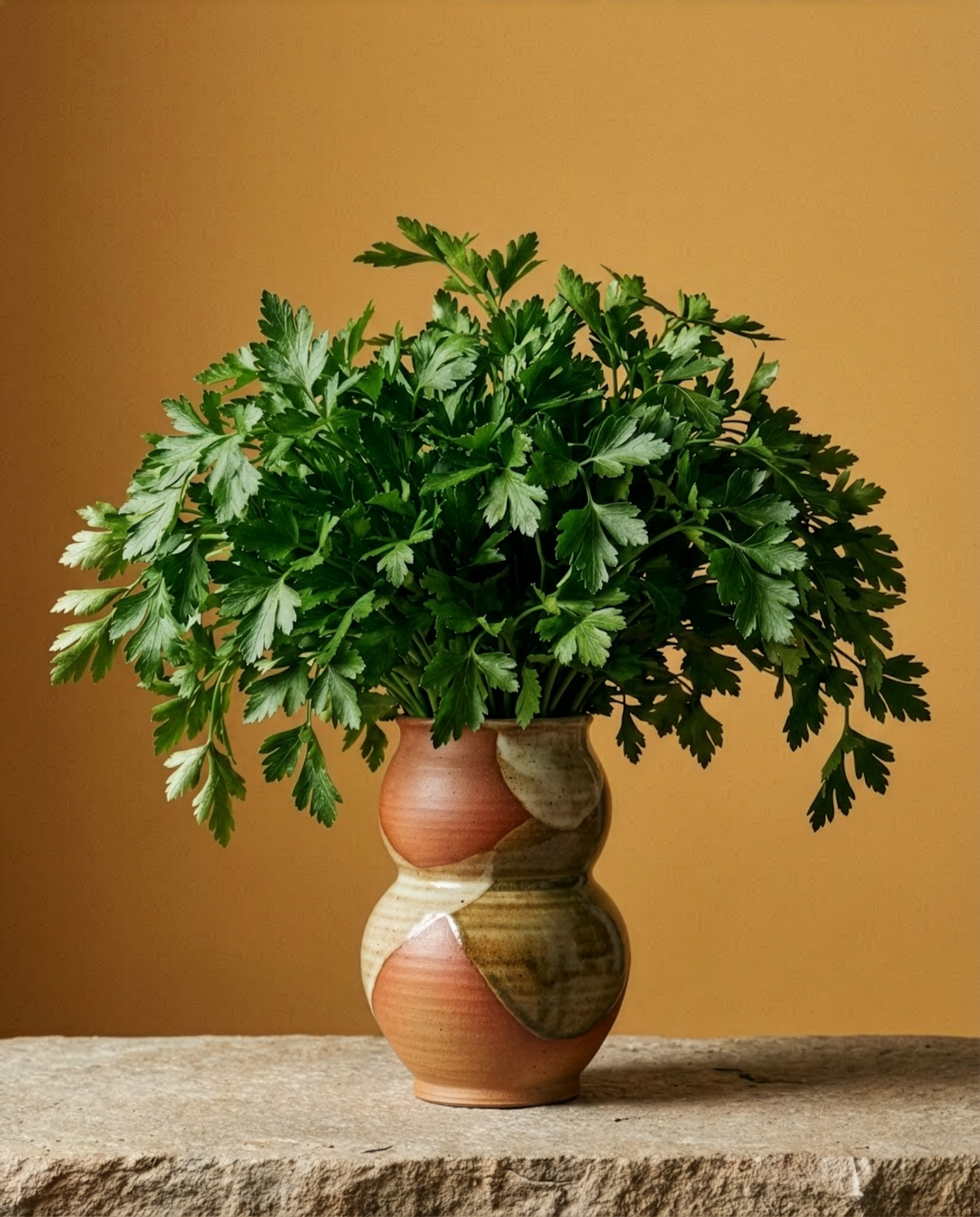 A fresh parsley bouquet in a rustic ceramic vase against a warm orange background, creating a natural and earthy aesthetic.