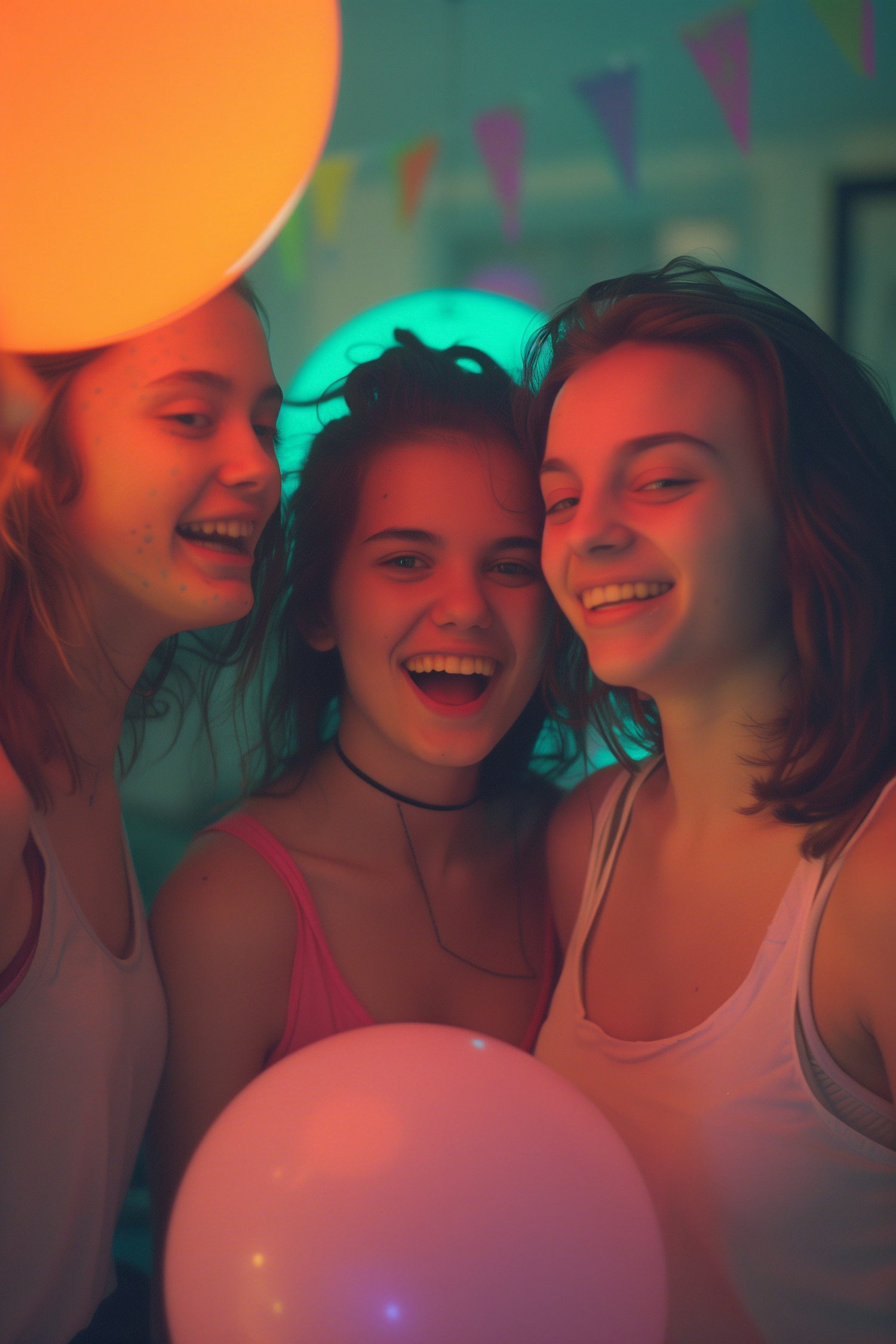 Three young women smiling with glowing balloons at a festive gathering, surrounded by colorful lights and decorations.