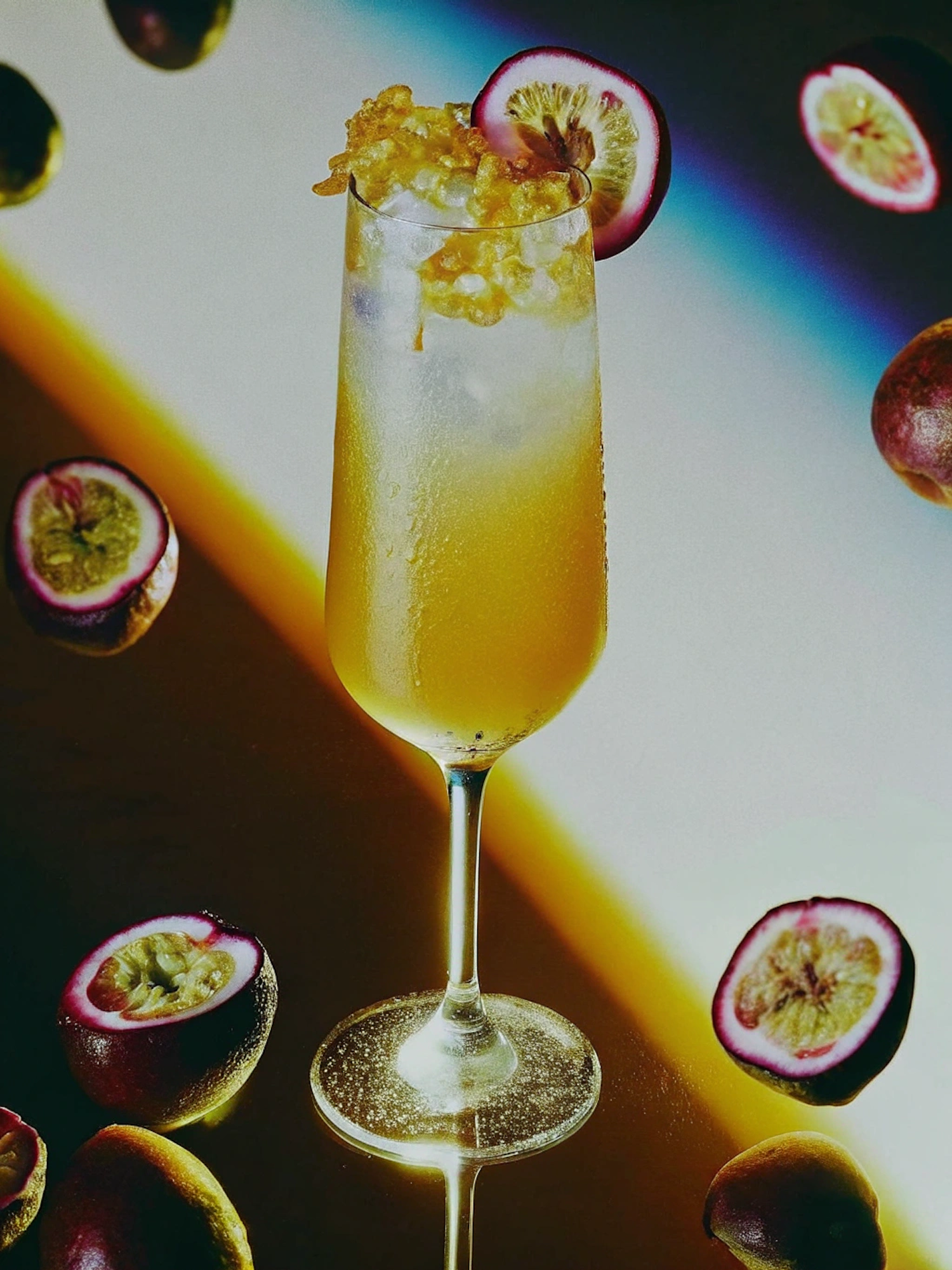 A vibrant yellow-orange cocktail in a tall glass, topped with crushed ice and passion fruit, surrounded by halved and whole passion fruits.