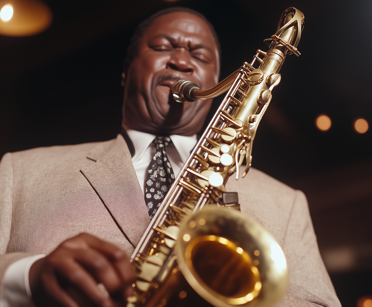 A musician in a suit passionately plays a golden saxophone, eyes closed, in a warmly lit setting.