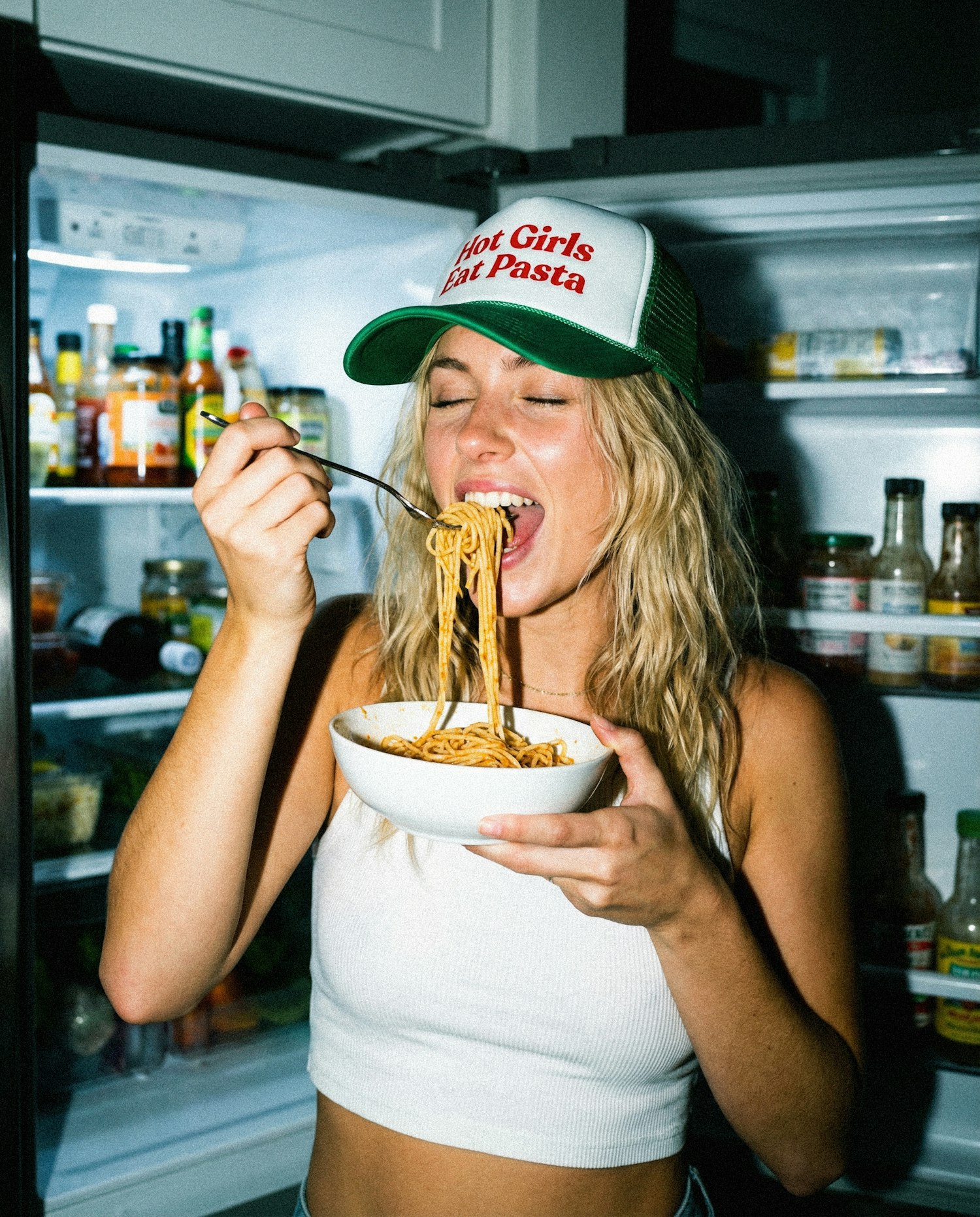 A woman enjoys spaghetti in front of an open fridge, wearing a 'Hot Girls Eat Pasta' hat, creating a fun and casual vibe.