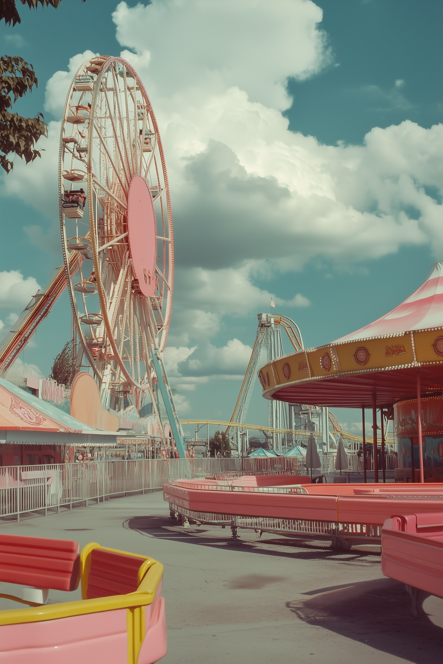 Pastel-colored amusement park with a Ferris wheel and carousel under a bright blue sky with fluffy clouds.