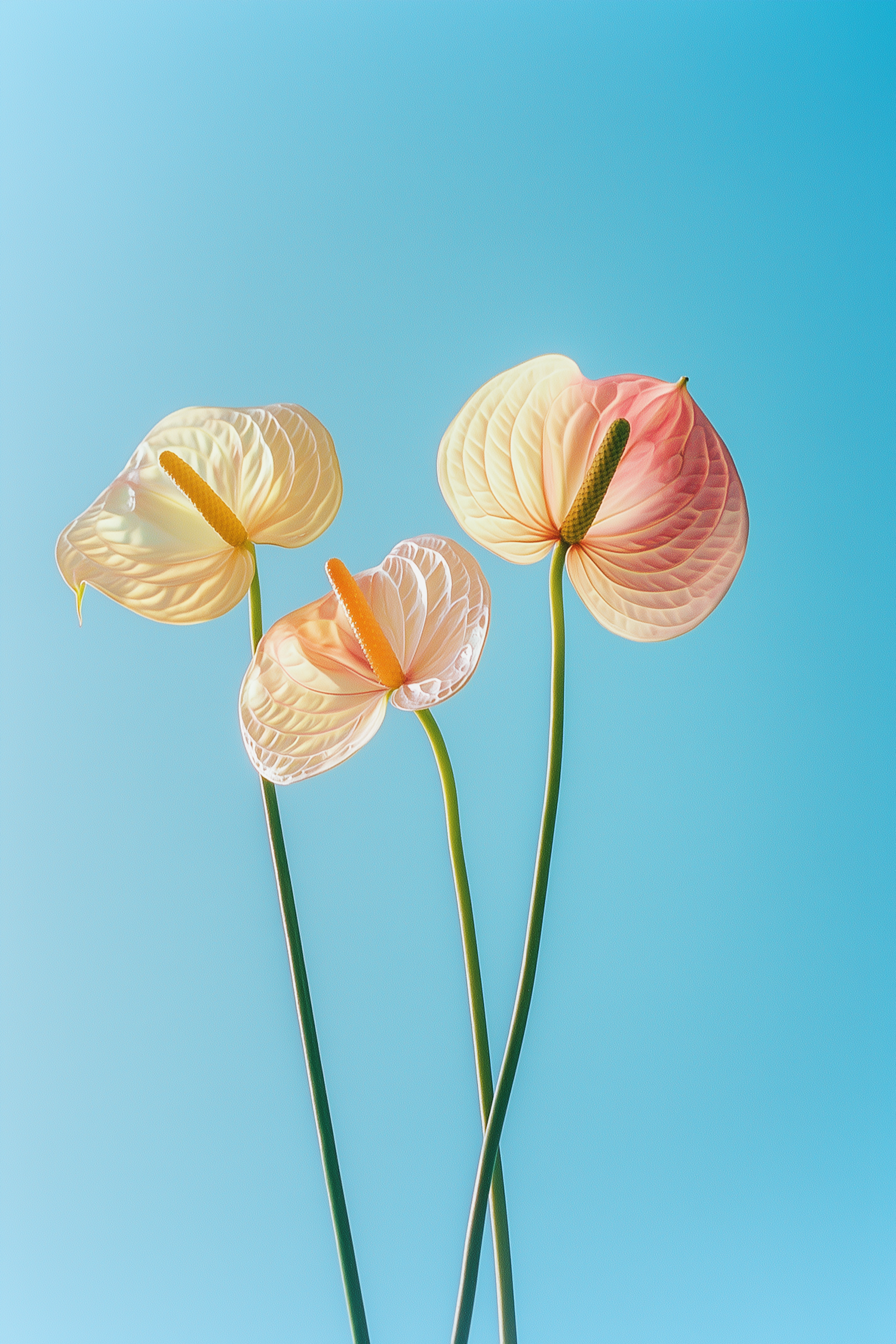 Three pastel anthurium flowers with translucent petals and green stems set against a vibrant blue background. Perfect for nature lovers.