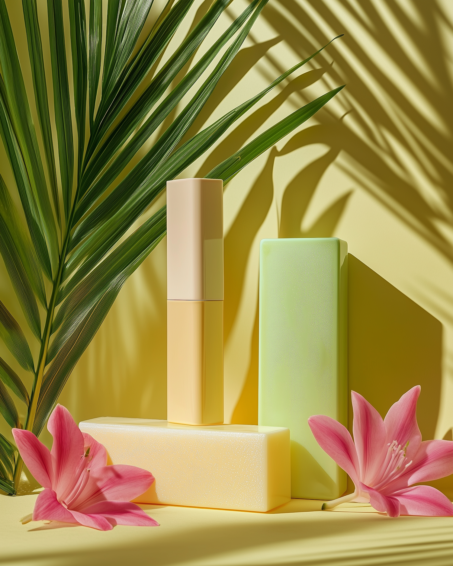 Elegant pastel cosmetic bottles with pink lilies and palm leaf shadows on a yellow background, evoking a tropical, refreshing vibe.