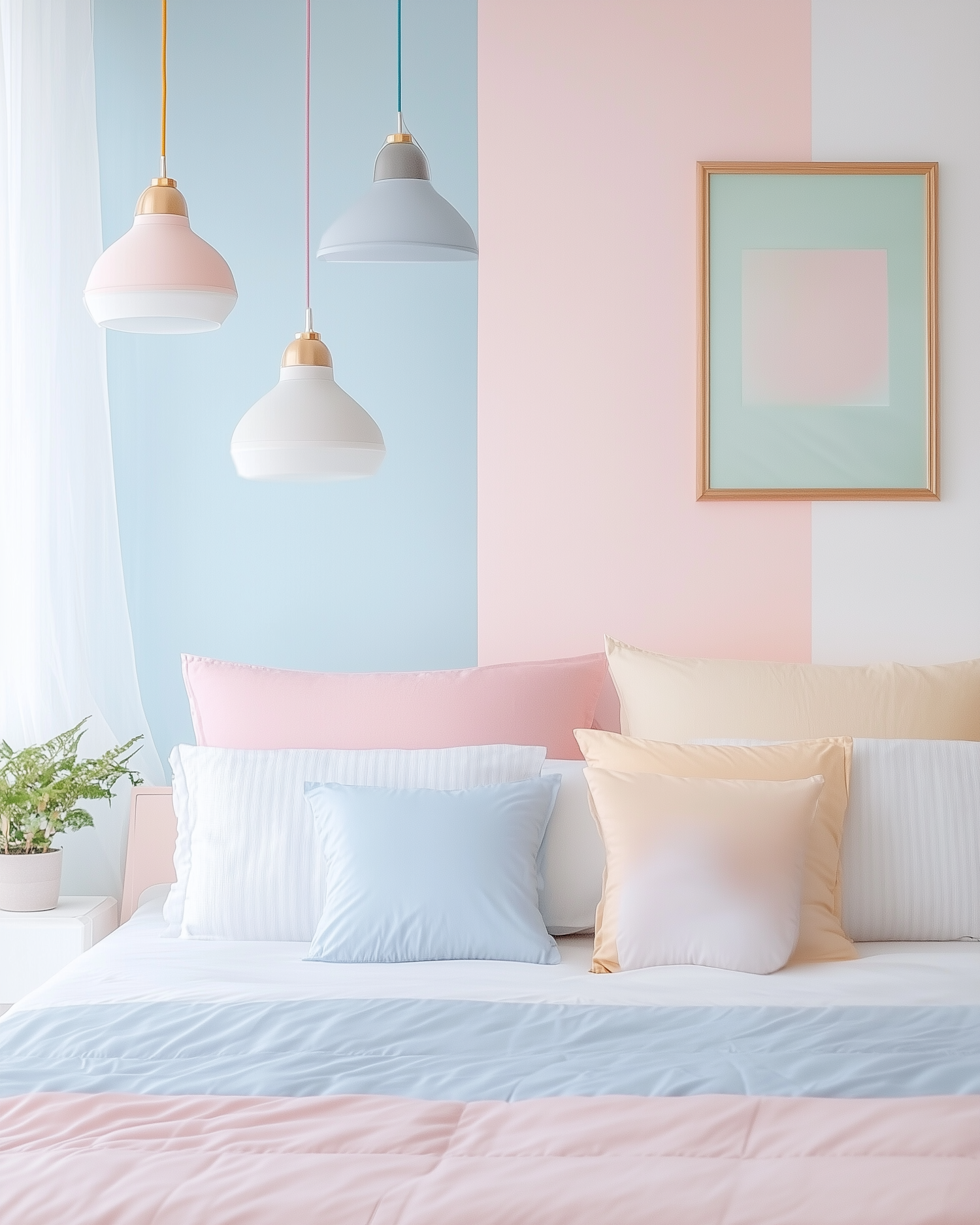 Pastel bedroom with soft pillows, color-block walls, and pendant lights. A cozy, modern vibe with minimalist decor and a touch of greenery.