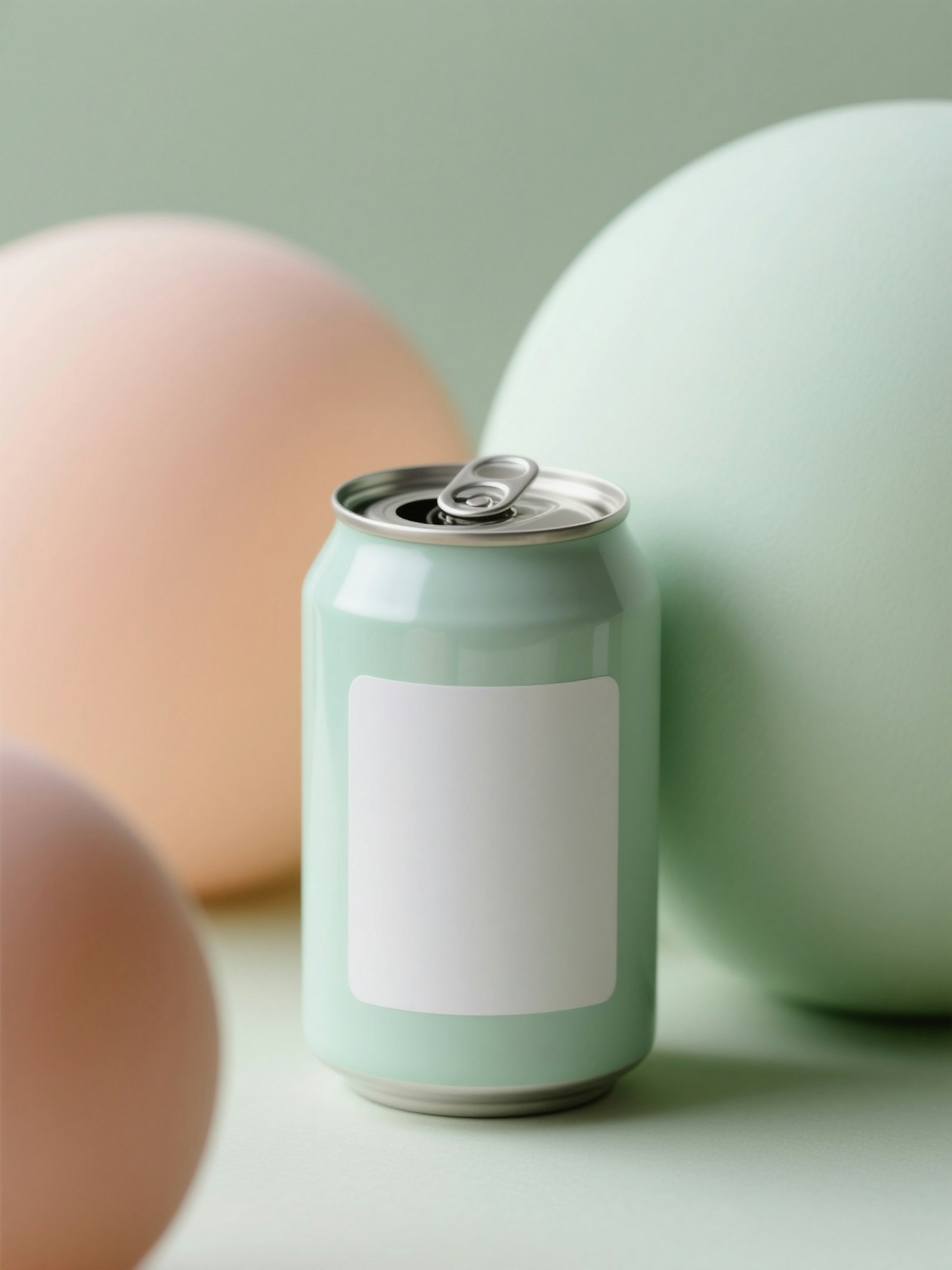 Minimalist pastel green can with blank label, surrounded by soft peach and green spheres, perfect for branding or product mockups.
