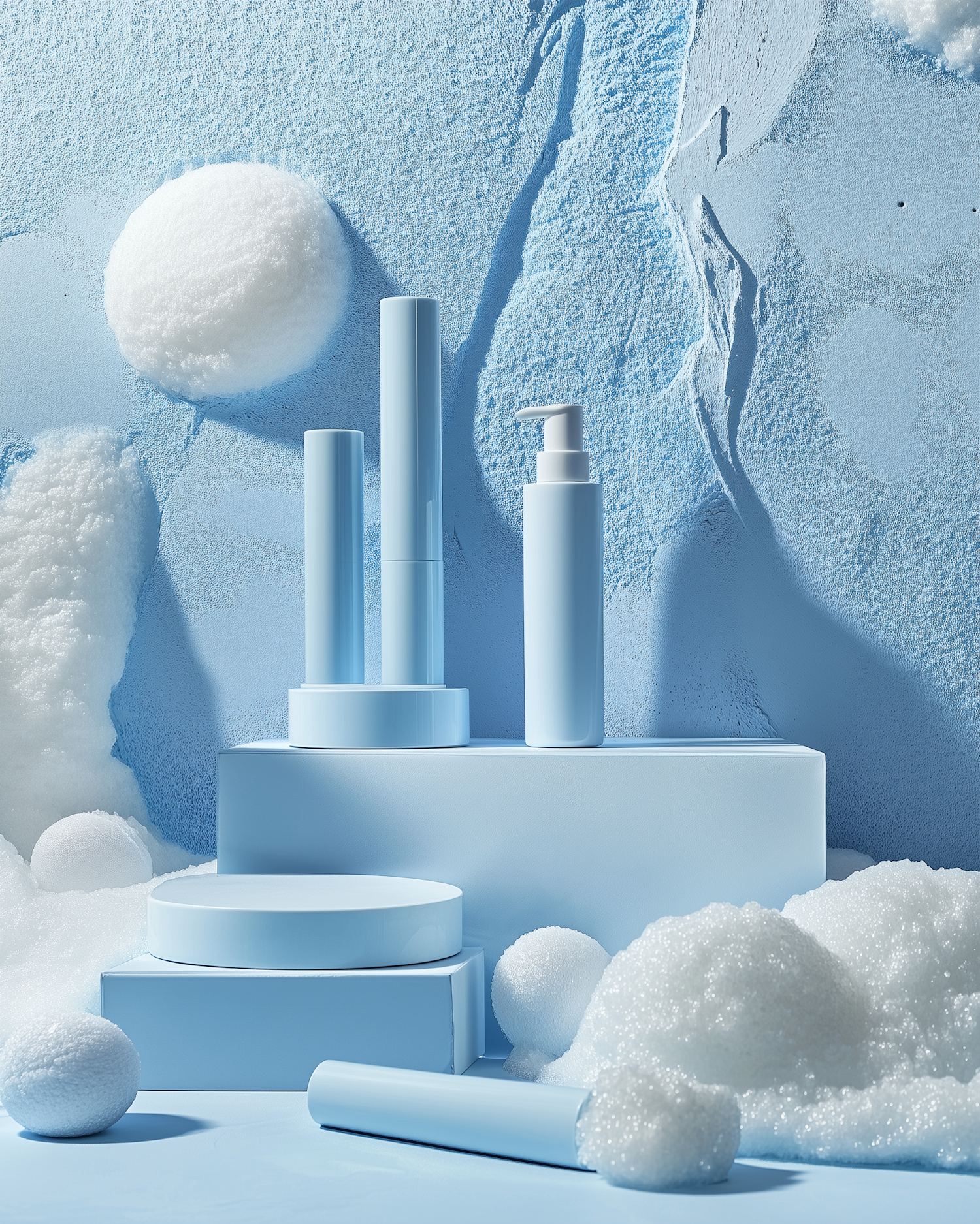 Minimalist skincare product display with pastel blue containers and fluffy white textures, creating a serene and modern aesthetic.