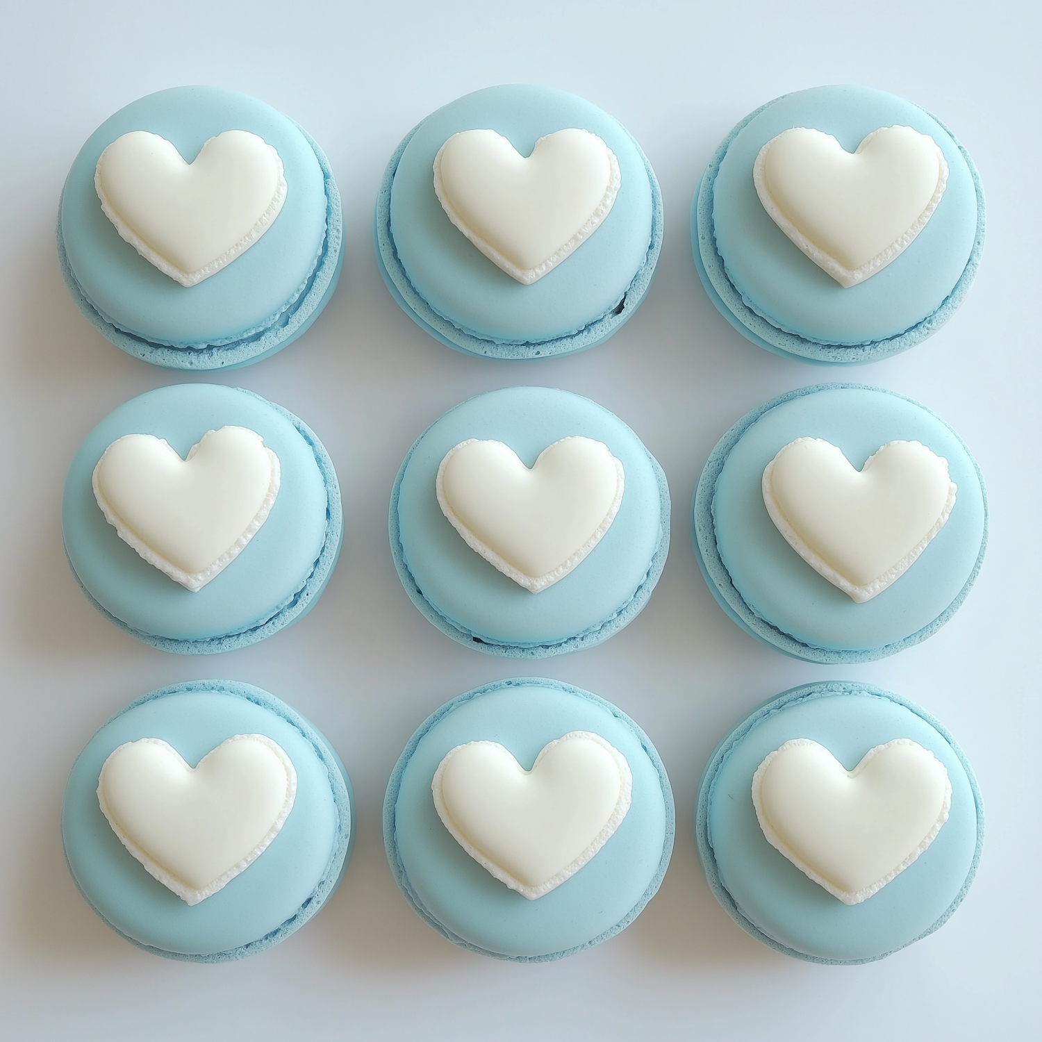 Nine pastel blue macarons with white heart toppers arranged in a neat grid on a light background. Perfect for romantic or elegant themes.