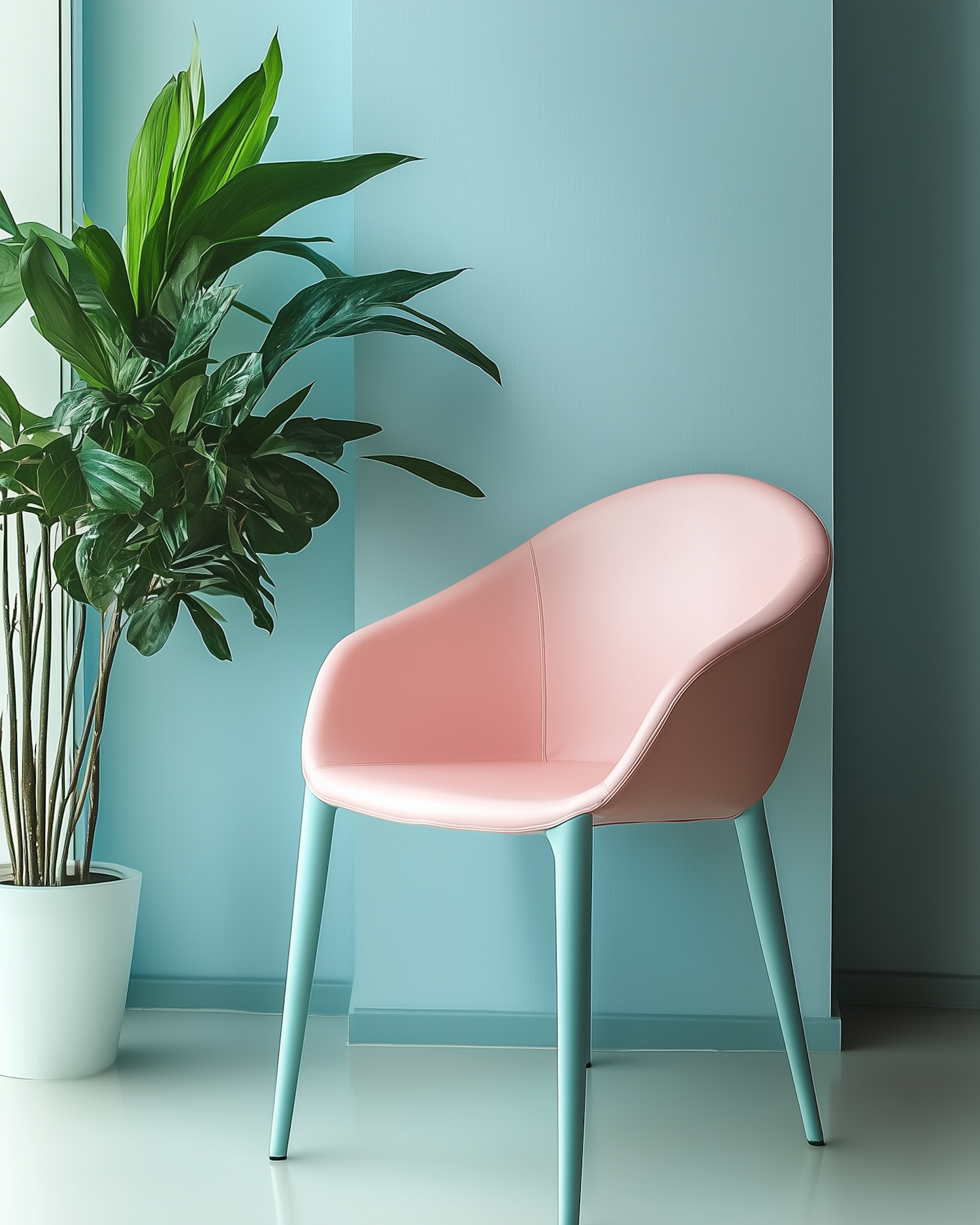 A pastel pink chair with teal legs sits beside a lush green potted plant against a teal wall, creating a serene and modern vibe.