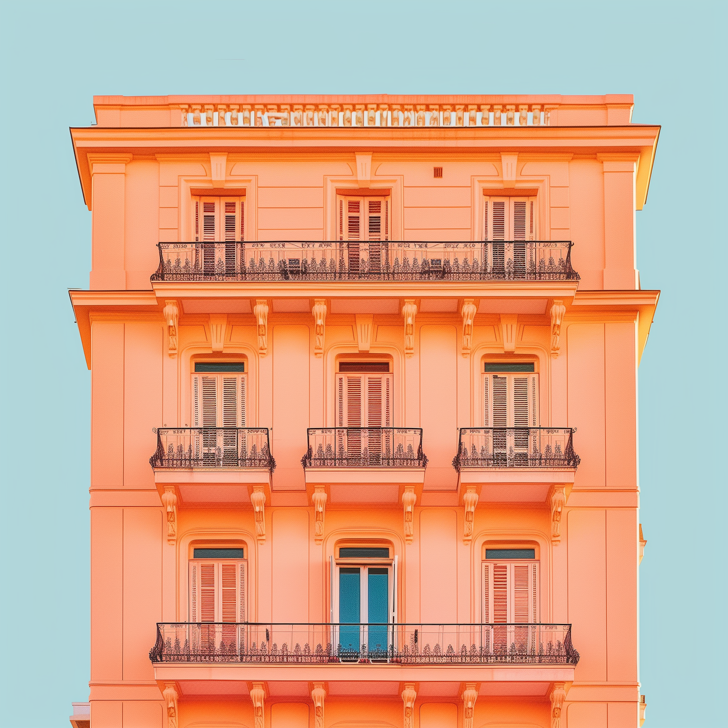 Vibrant peach building with black wrought-iron balconies against a clear blue sky, showcasing European architectural style.