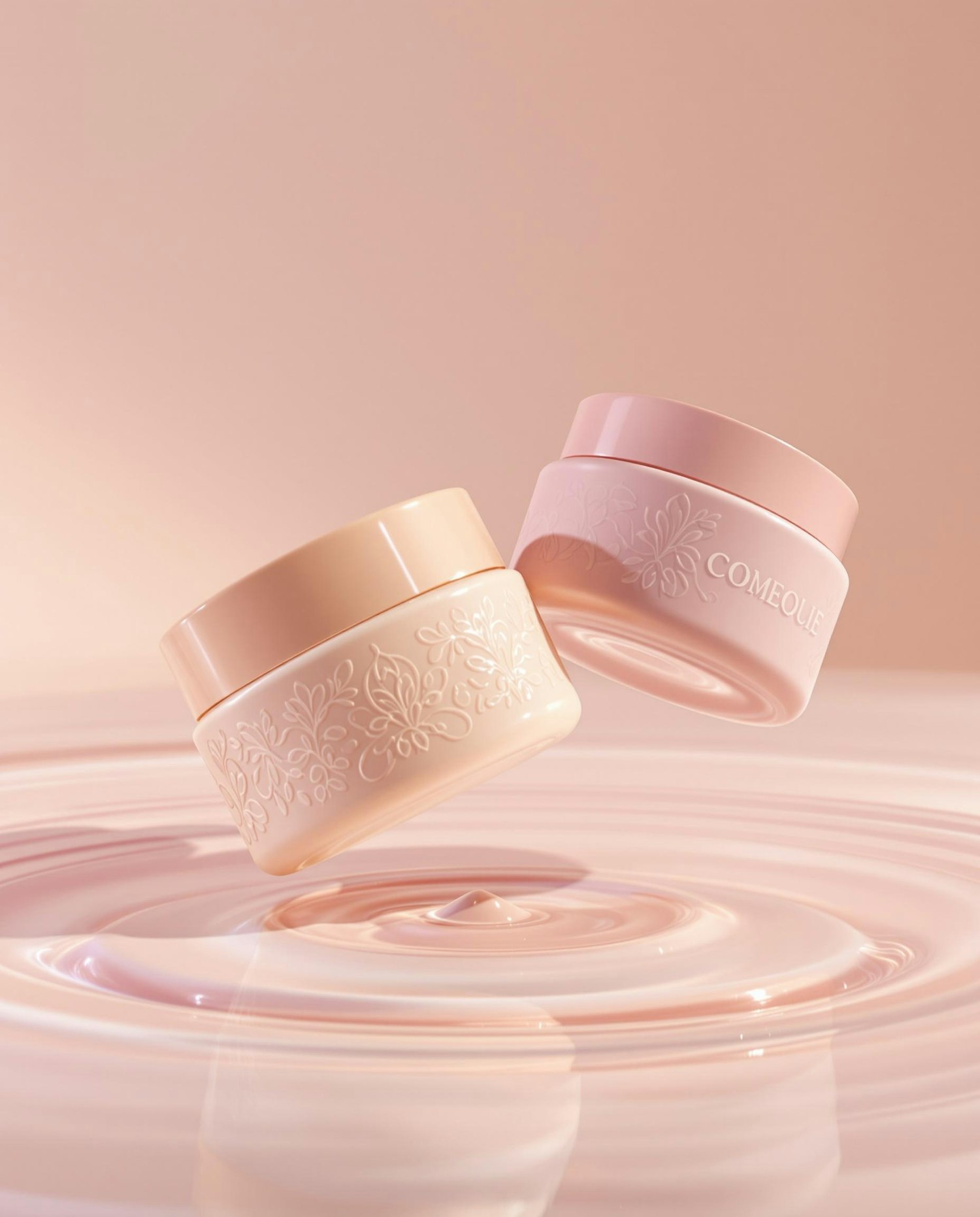 Elegant pastel cosmetic jars with floral embossing, floating above rippling creamy liquid, perfect for skincare branding.