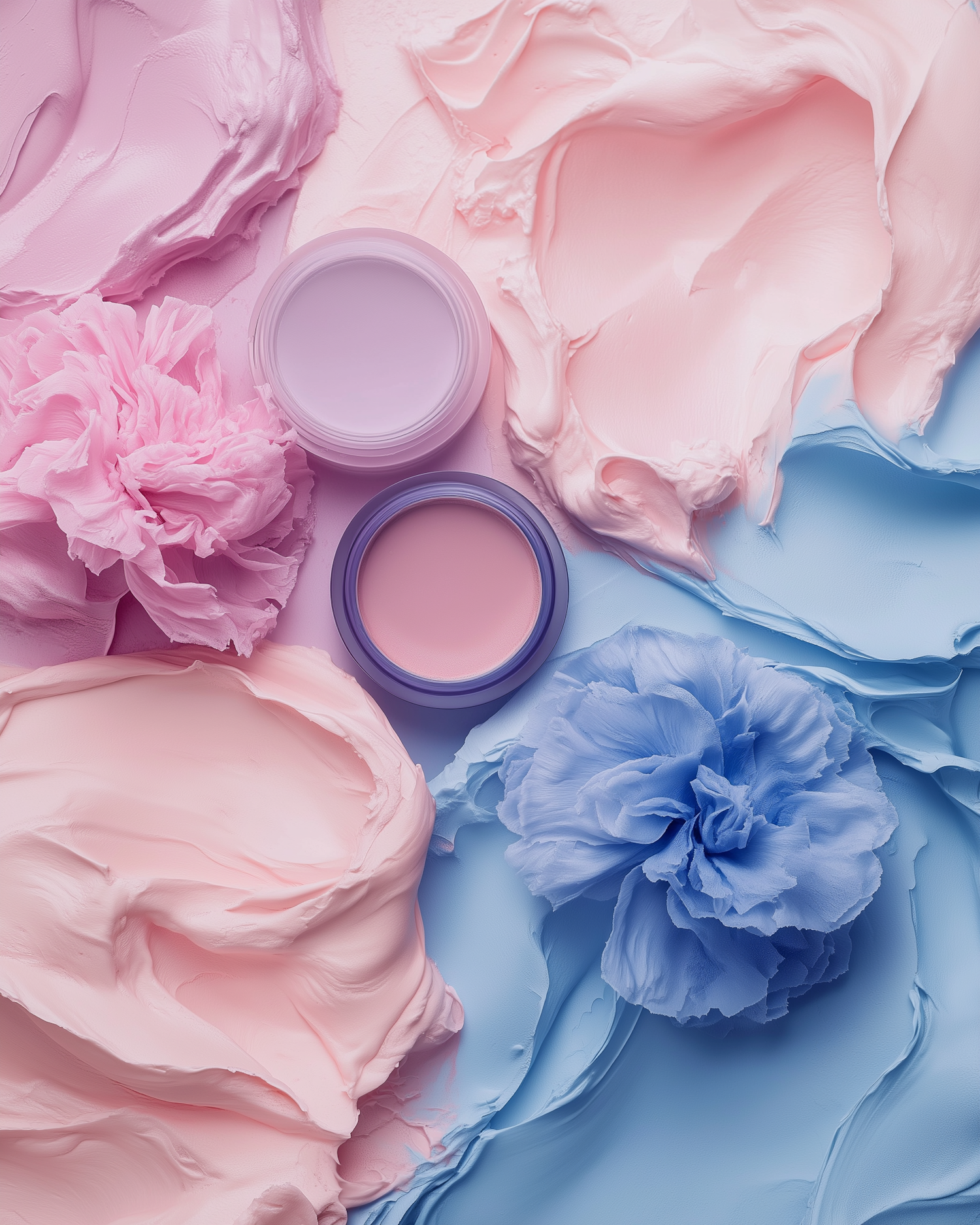 Pastel creams and textures in pink, lavender, and blue create a soothing, artistic composition with open jars and flower-like formations.