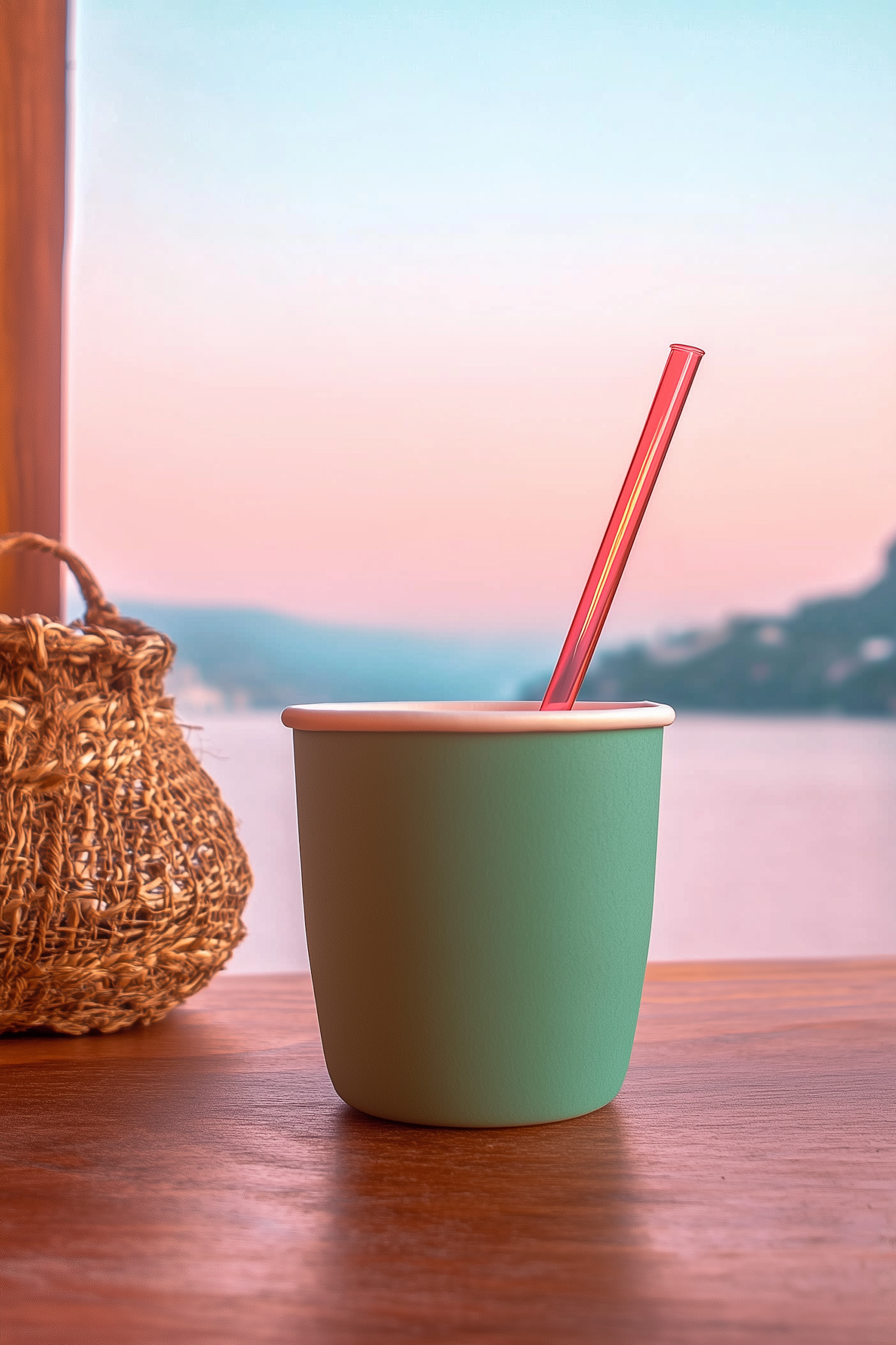 A pastel green cup with a red straw on a wooden table, set against a serene sunset view with a woven basket adding rustic charm.