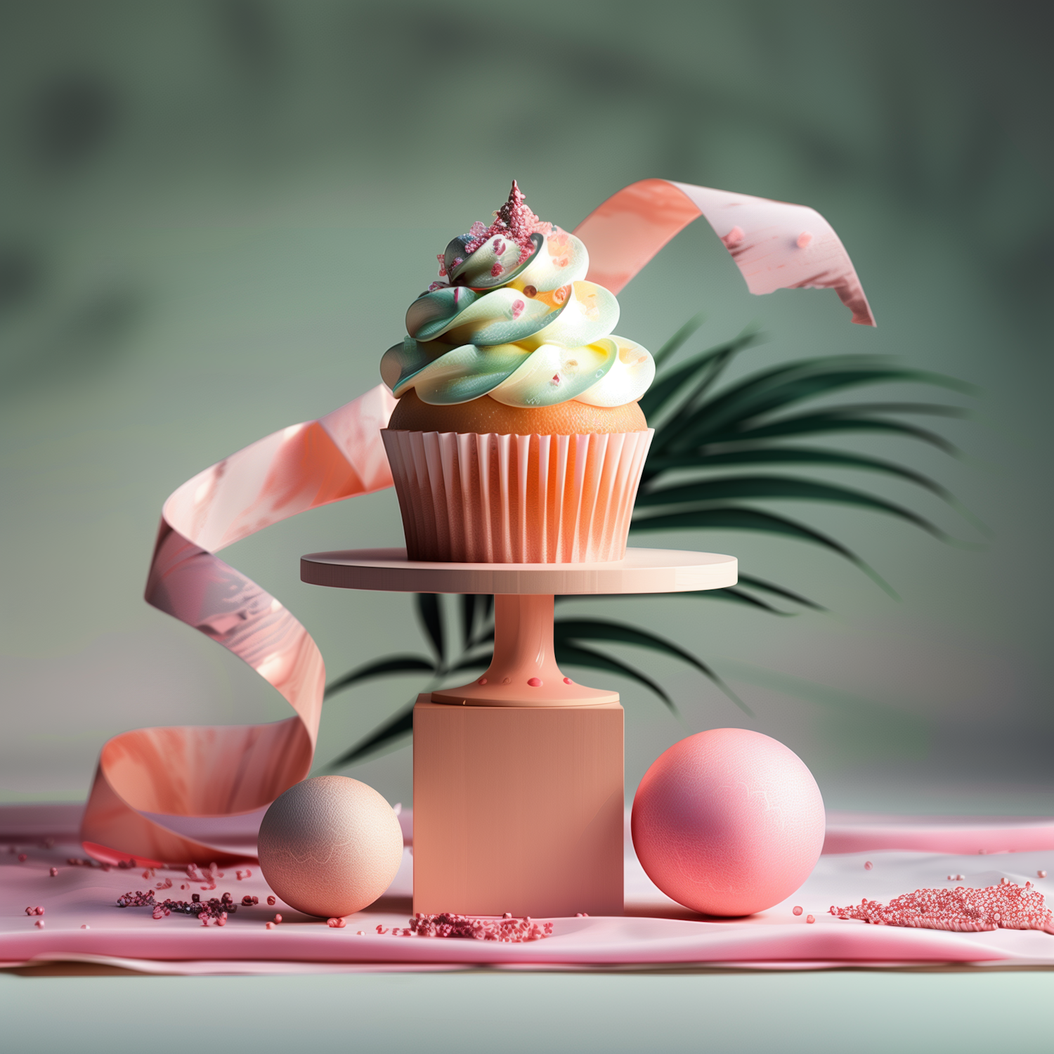 Whimsical cupcake with pastel frosting on a pedestal, surrounded by pink ribbon and spheres, set against a tropical-themed background.