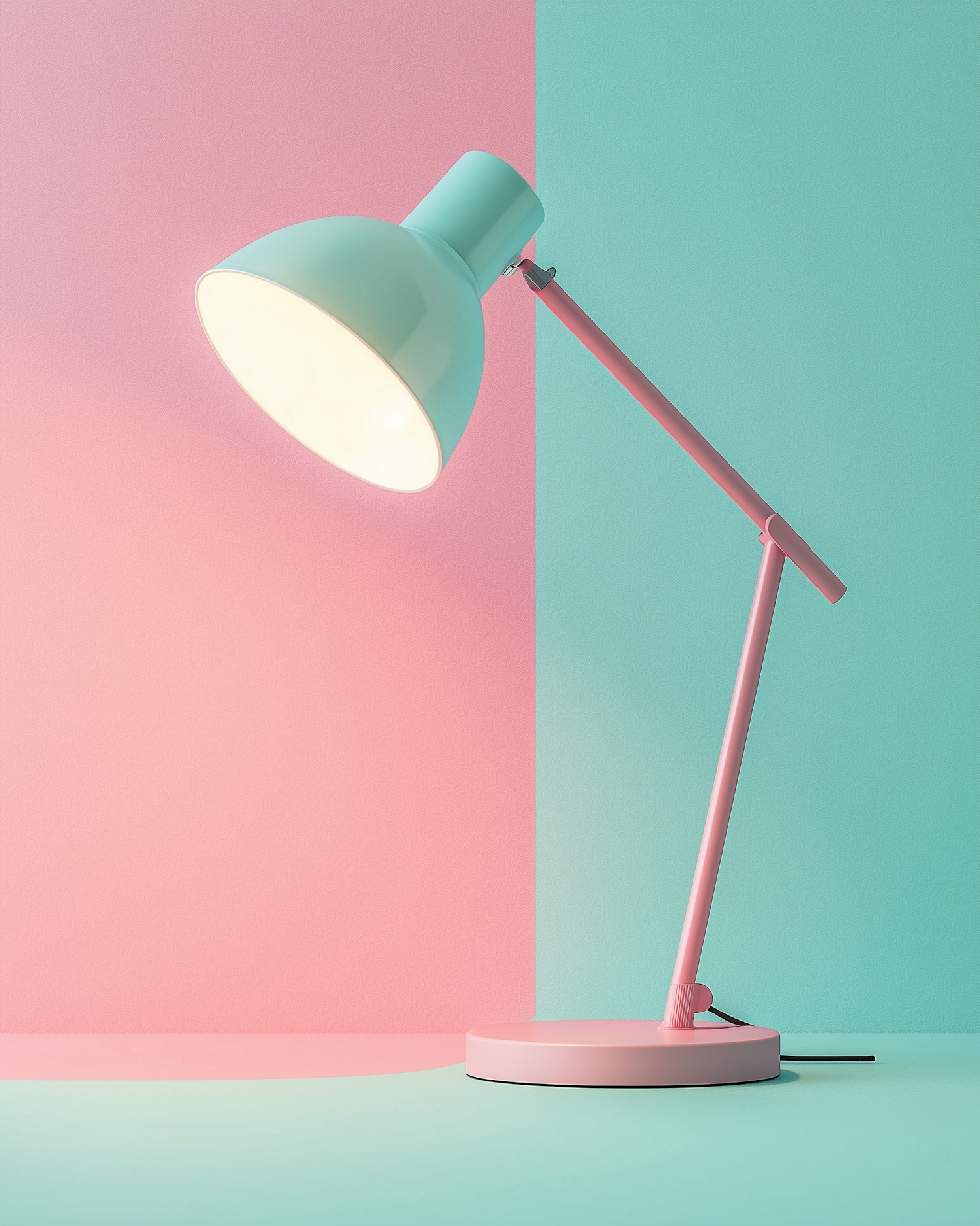 A pastel desk lamp with a teal shade and pink base glows softly against a split pink and teal background. Modern and minimal design.
