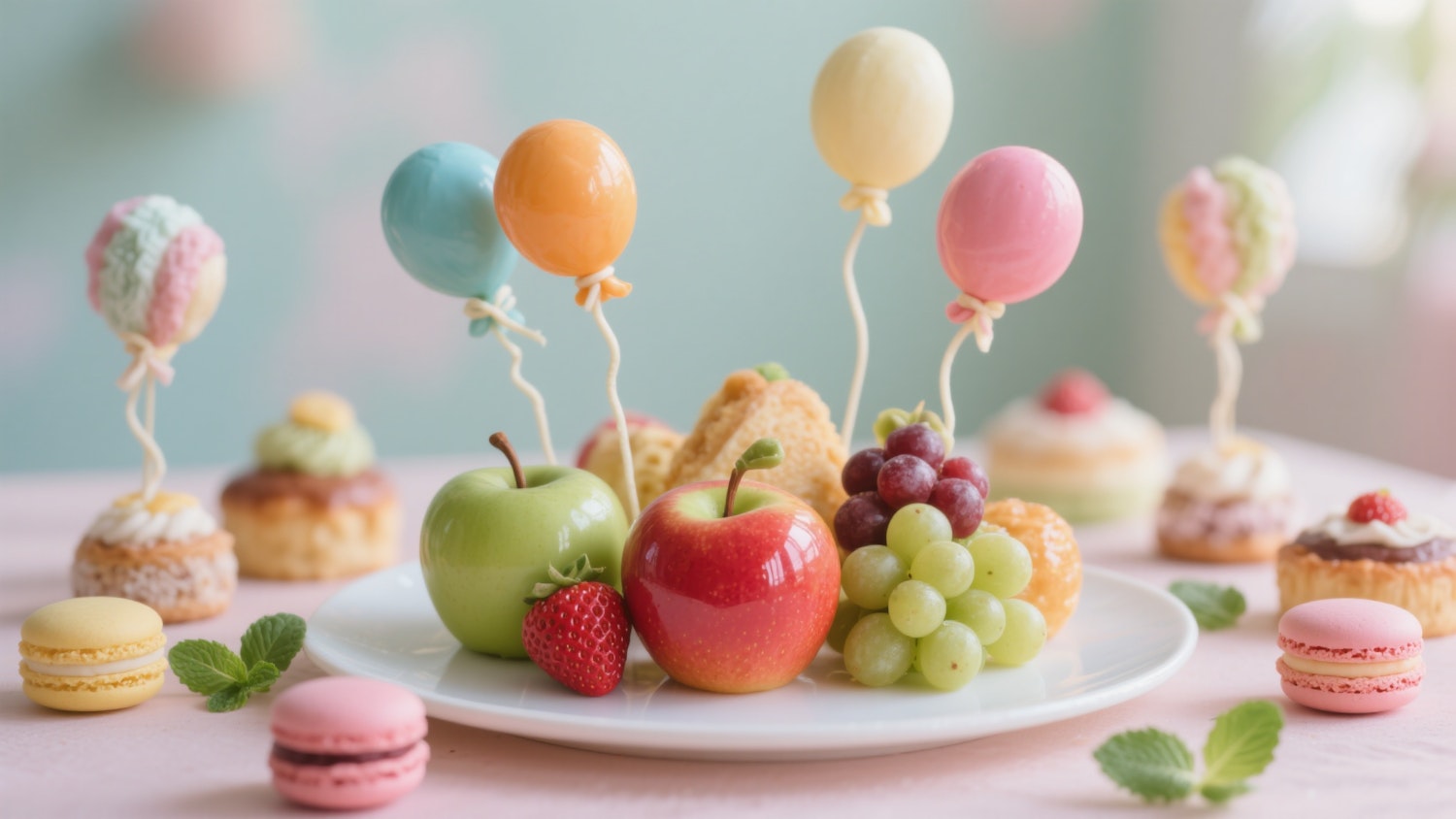 A colorful dessert arrangement with fruits, macarons, and pastries on a pastel table, adorned with decorative balloon toppers.