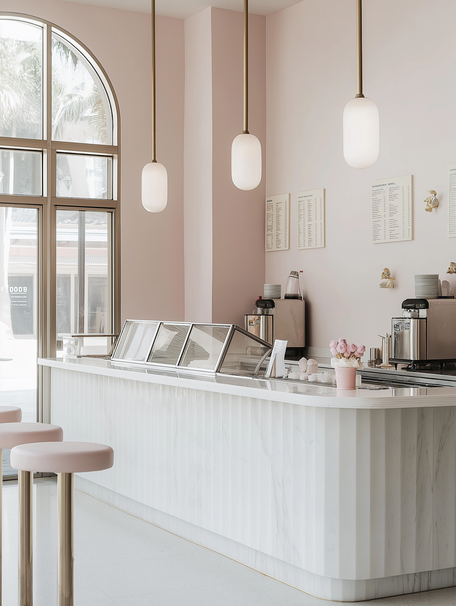 Chic pastel dessert shop with pink walls, marble counter, and modern pendant lights. Bright, airy vibe with minimalist decor.