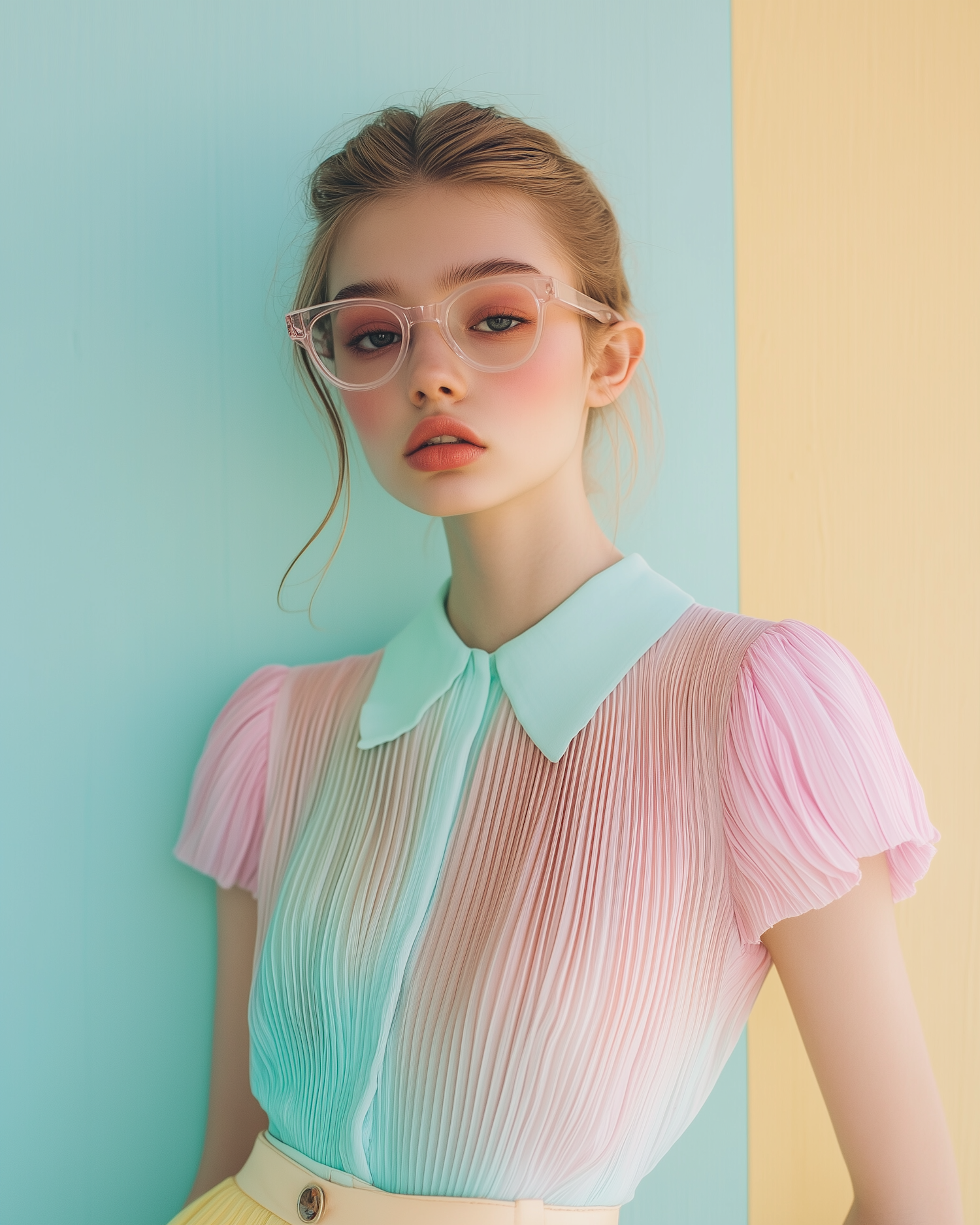 Stylish woman in pastel pleated blouse and pink glasses against a mint and yellow background, exuding a dreamy, modern aesthetic.
