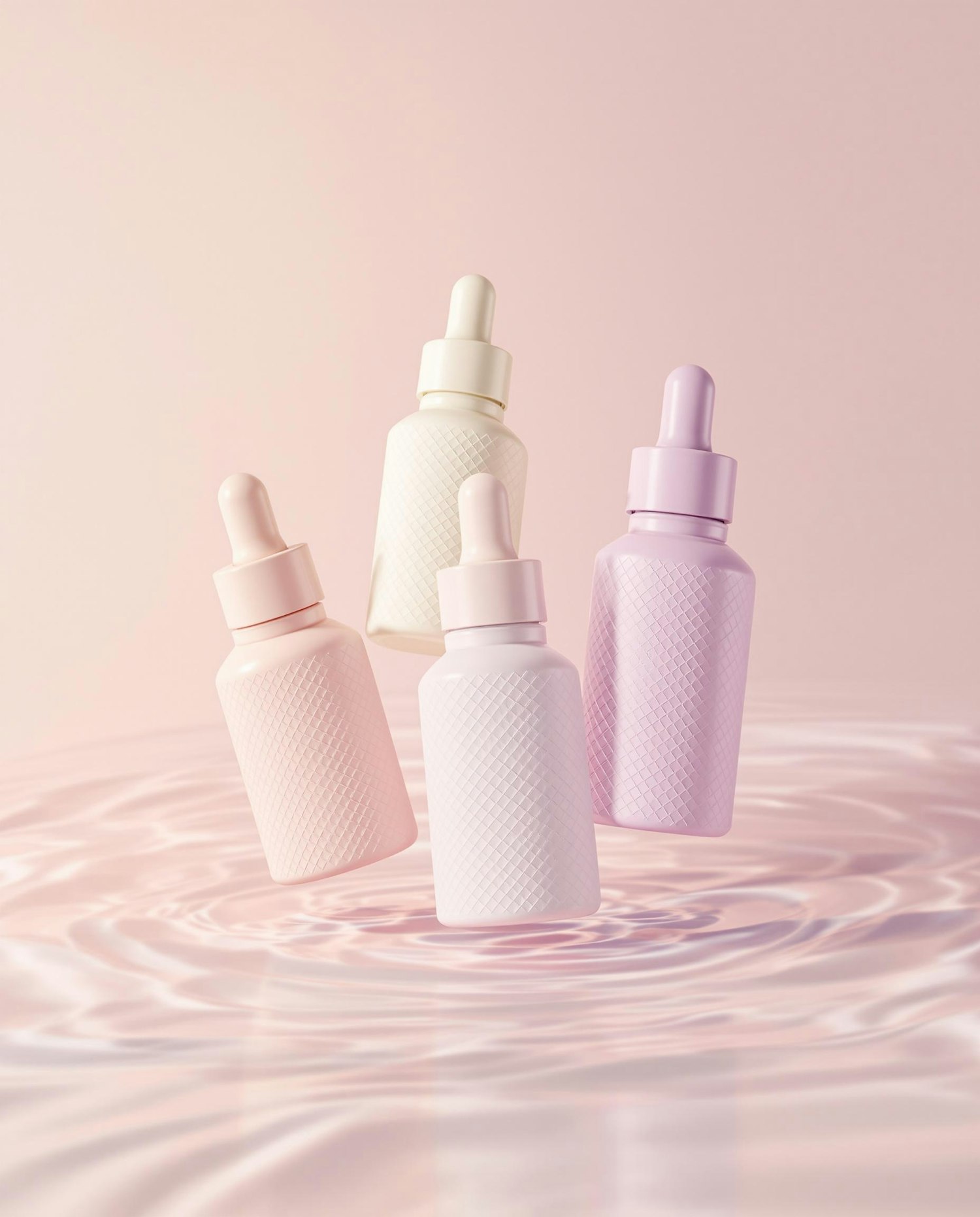 Elegant pastel dropper bottles with textured design floating above rippling water, set against a soft pink gradient background.