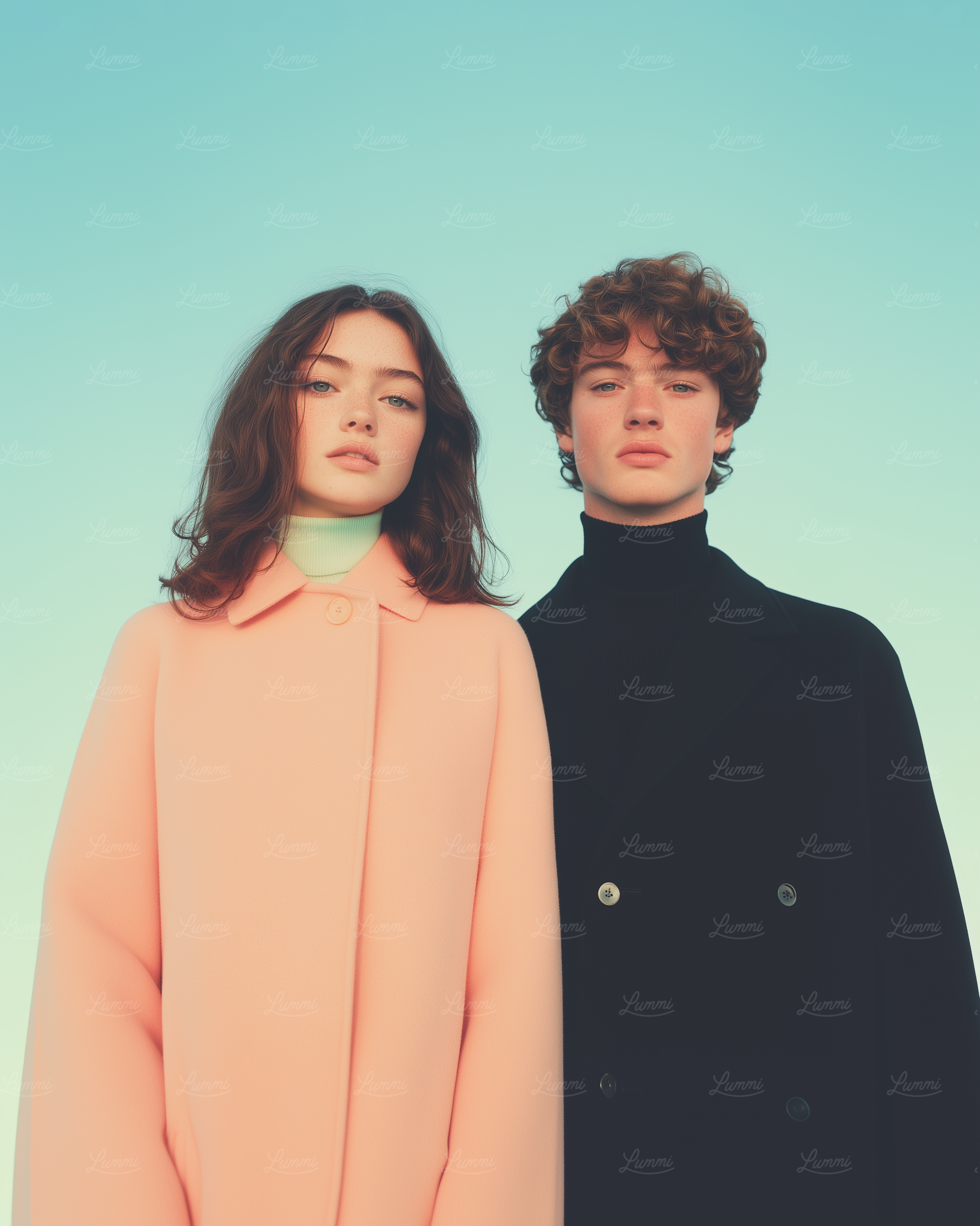 Stylish young duo in pastel and black coats against a clear blue sky, showcasing modern fashion with a minimalist vibe.