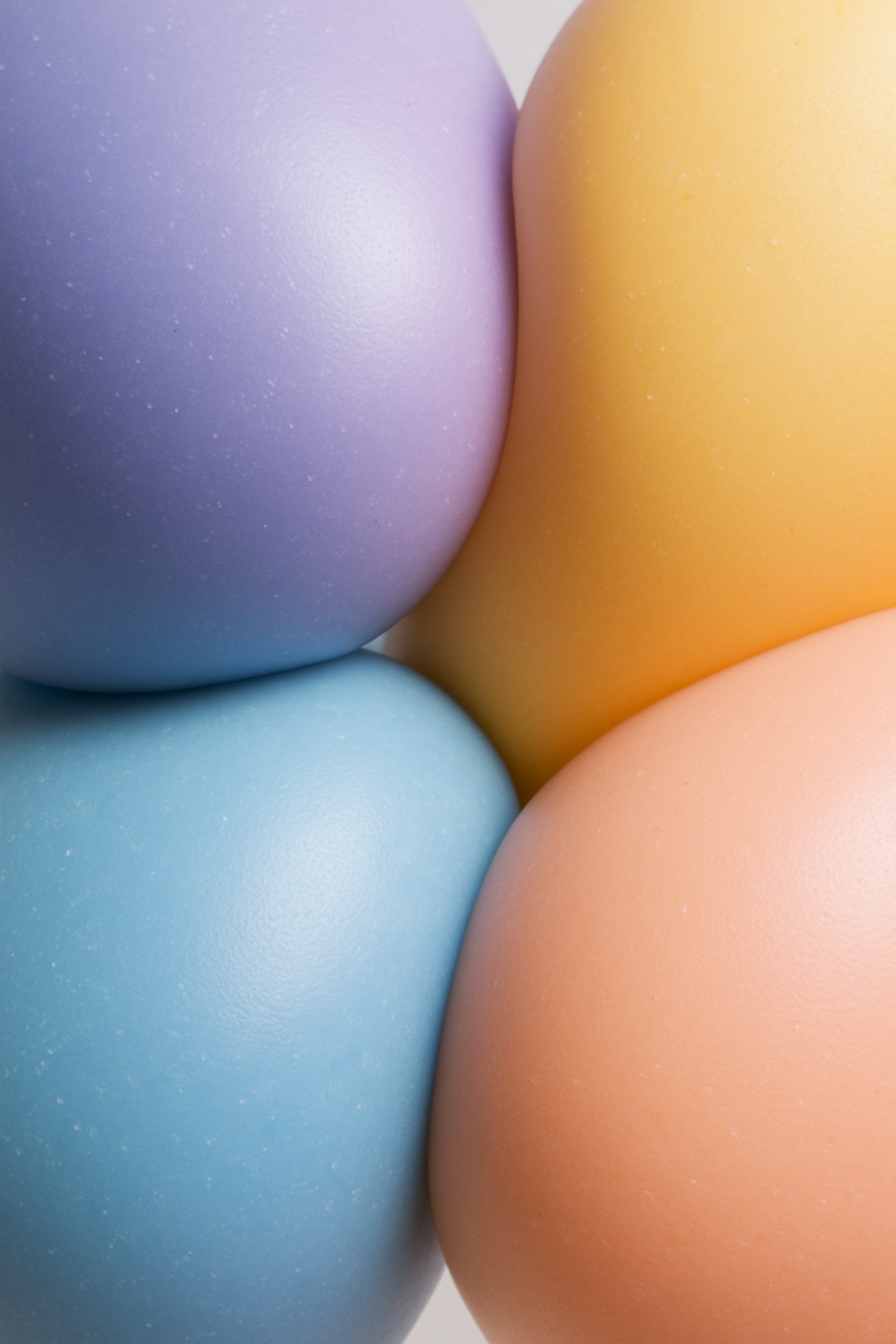 Four pastel-colored eggs in shades of purple, orange, blue, and peach, arranged closely against a plain background.