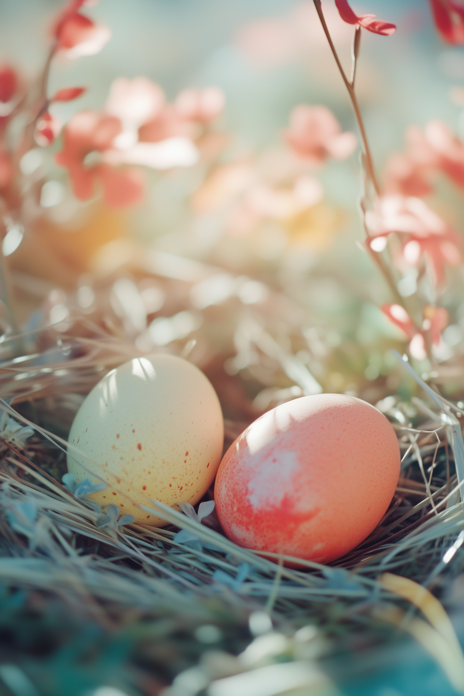 Two pastel-colored speckled eggs in a nest surrounded by pink flowers, bathed in warm sunlight.