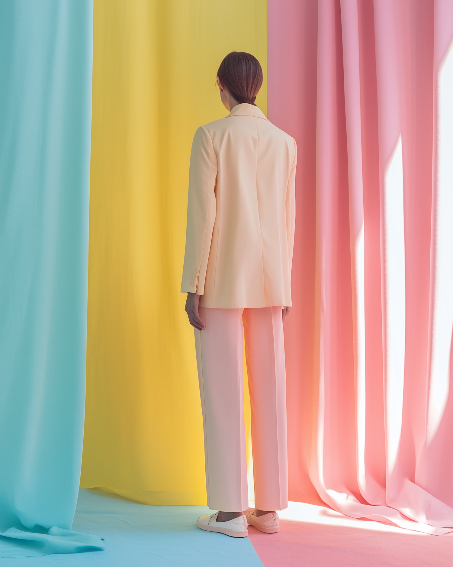 Person in pastel peach suit stands against colorful pastel drapes, creating a minimalist and stylish scene.