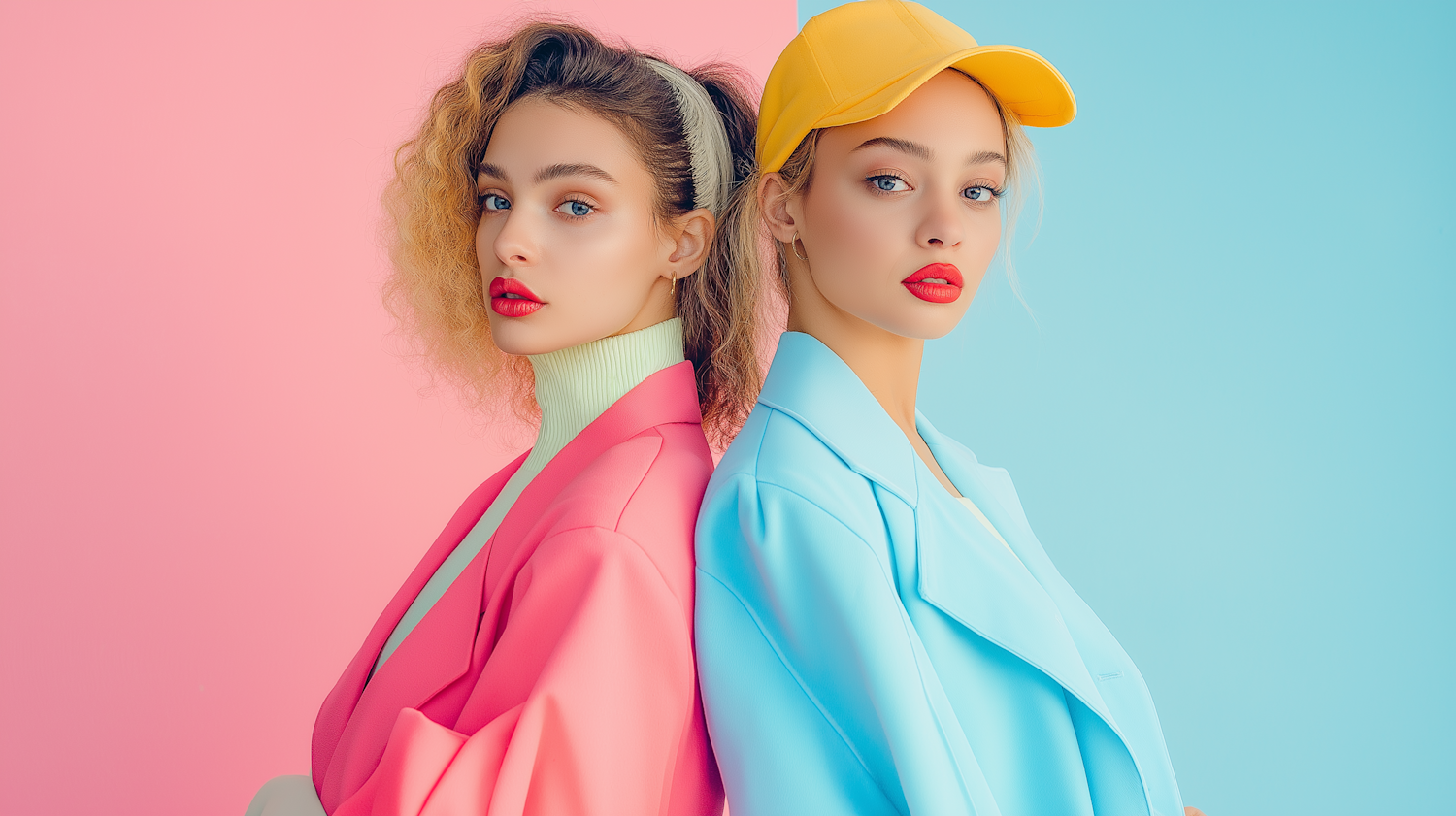 Two stylish women in pastel outfits pose confidently against a split pink and blue background, showcasing bold fashion and vibrant colors.