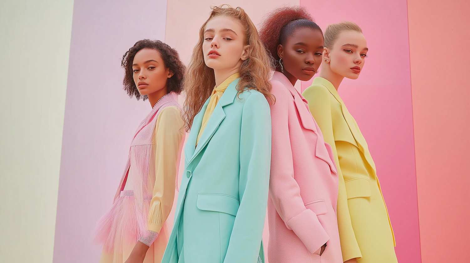 Four women in pastel outfits pose against a colorful background, showcasing modern fashion with mint, pink, and yellow tones.