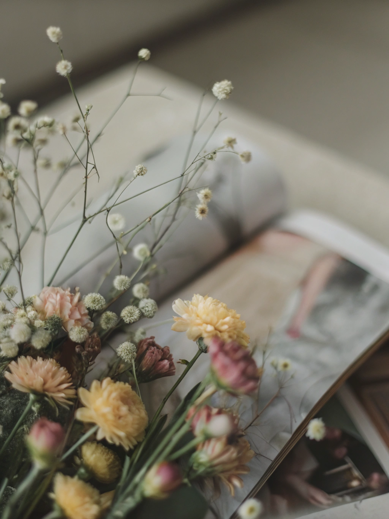 A dreamy floral arrangement with pastel blooms and baby's breath resting on an open magazine, creating a cozy and artistic vibe.