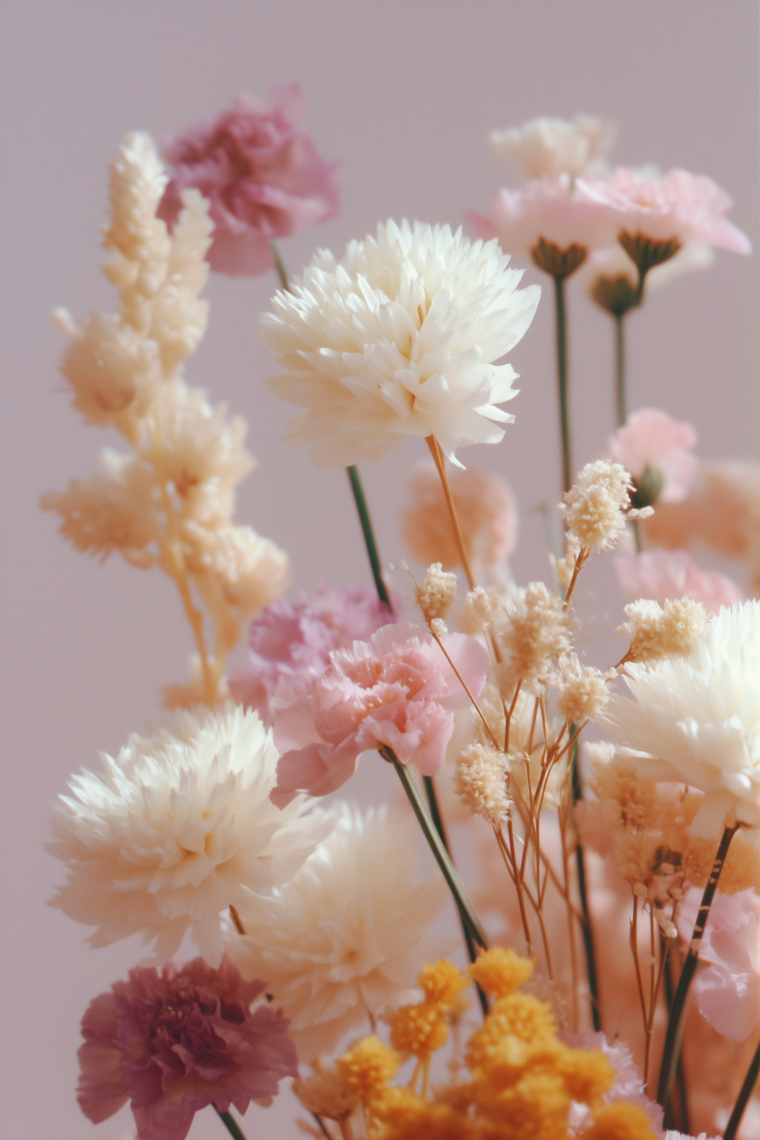 Soft pastel floral arrangement with white, pink, and yellow blooms against a muted pink background. Perfect for a serene, romantic vibe.